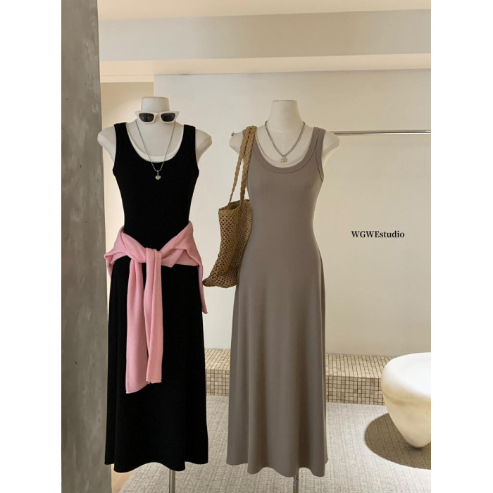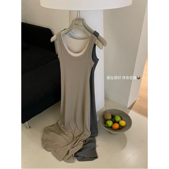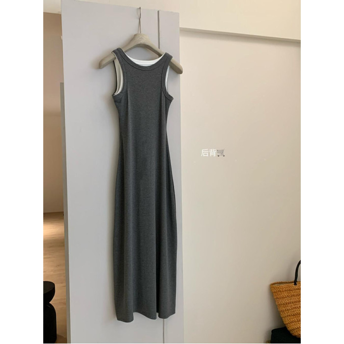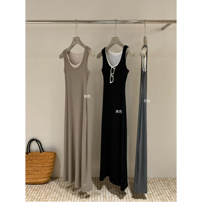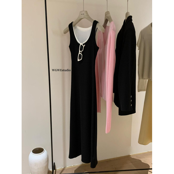 假兩件撞色針織背心吊帶連衣裙女春夏季修身內搭打底顯瘦長款裙子