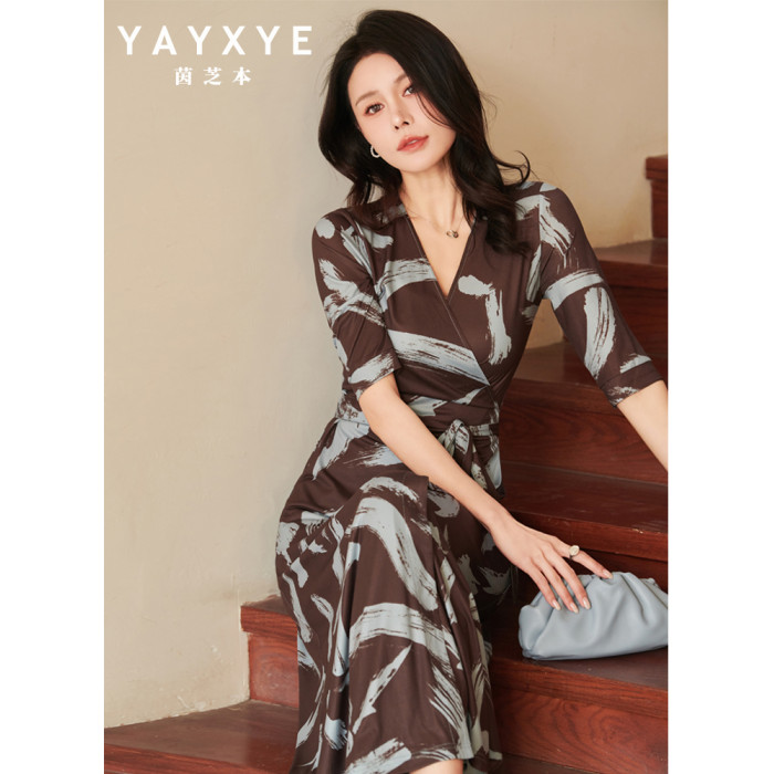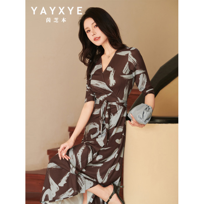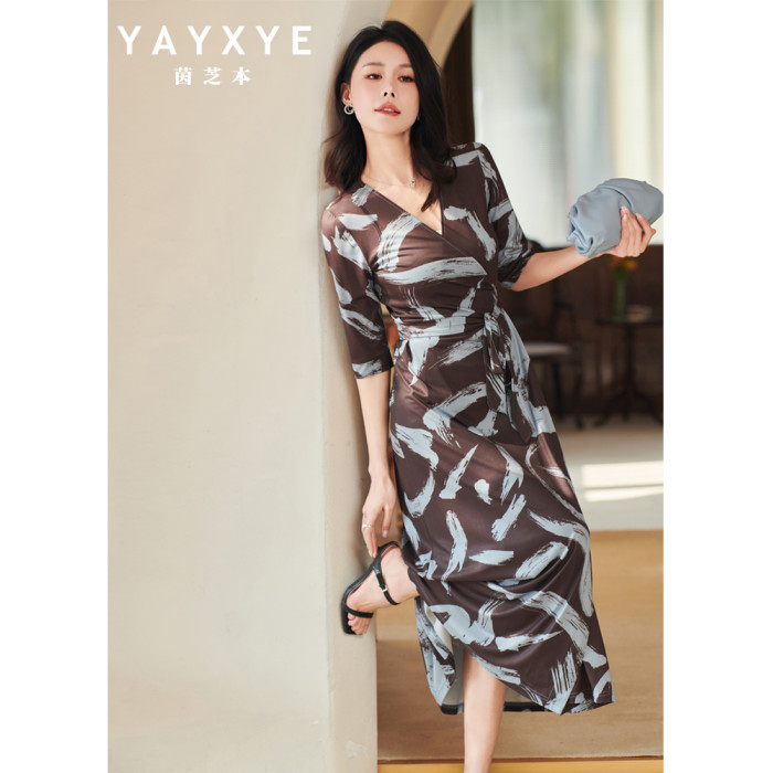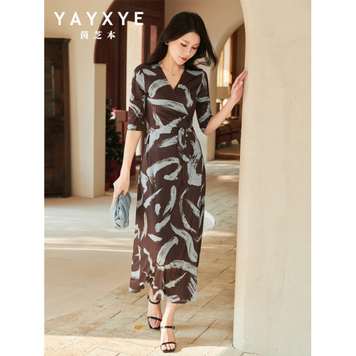 金喜同款一片式裹身裙女薄荷綠印花v領高級感連衣裙長裙女夏新款