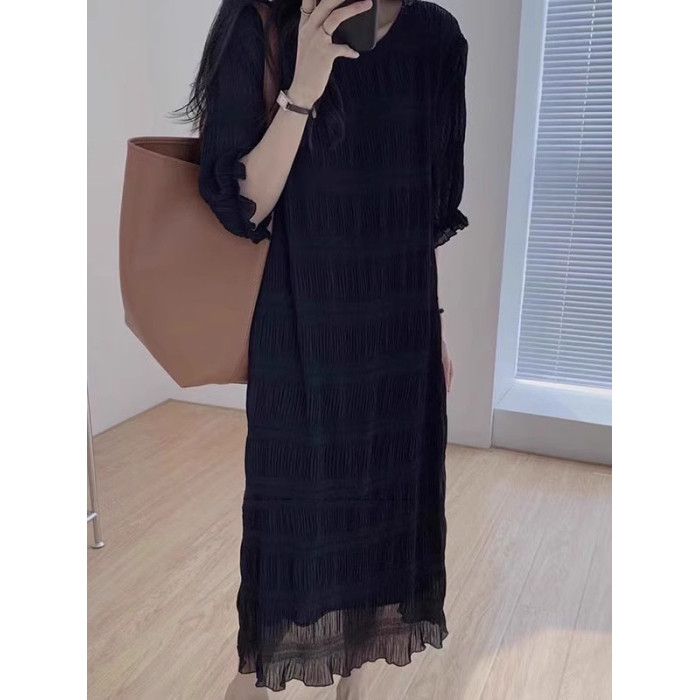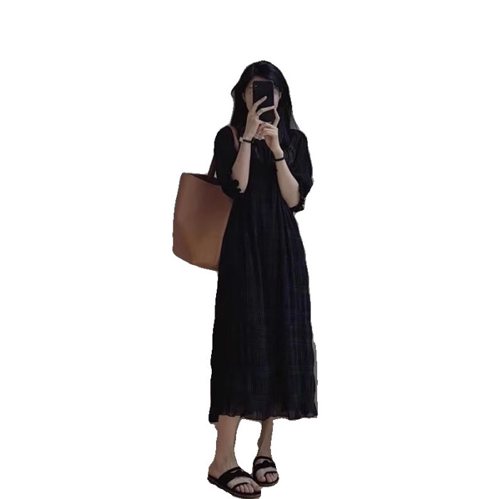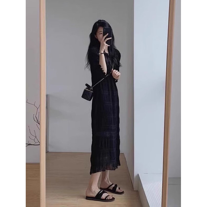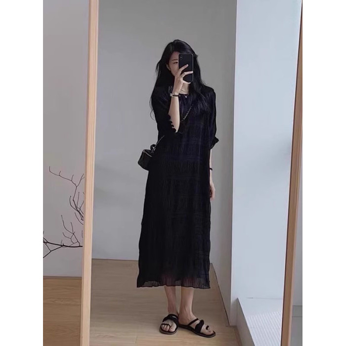 歐洲站2025夏季新款赫本風休閒小黑裙高級感名媛黑色寬松連衣裙女