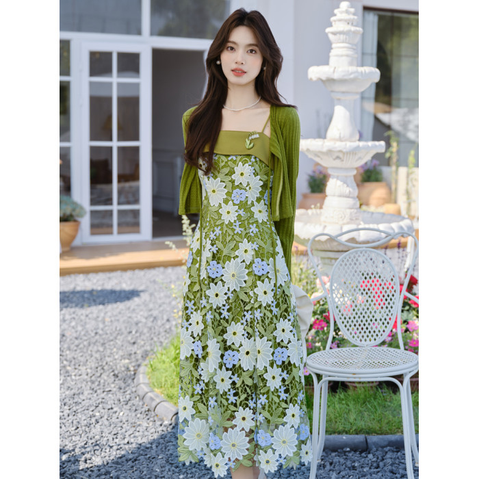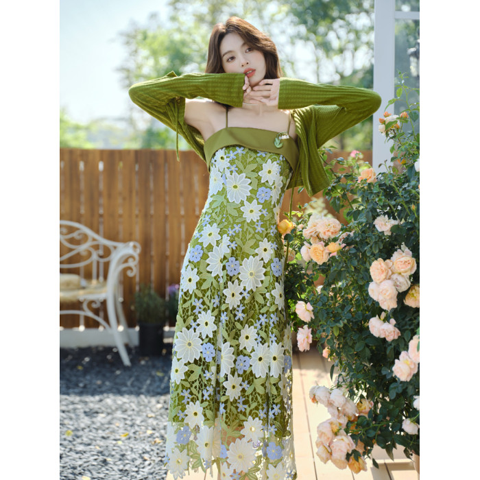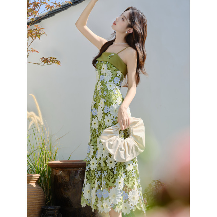 法式鏤空蕾絲綠色吊帶連衣長裙海邊度假沙灘多巴胺絕美小裙子夏日