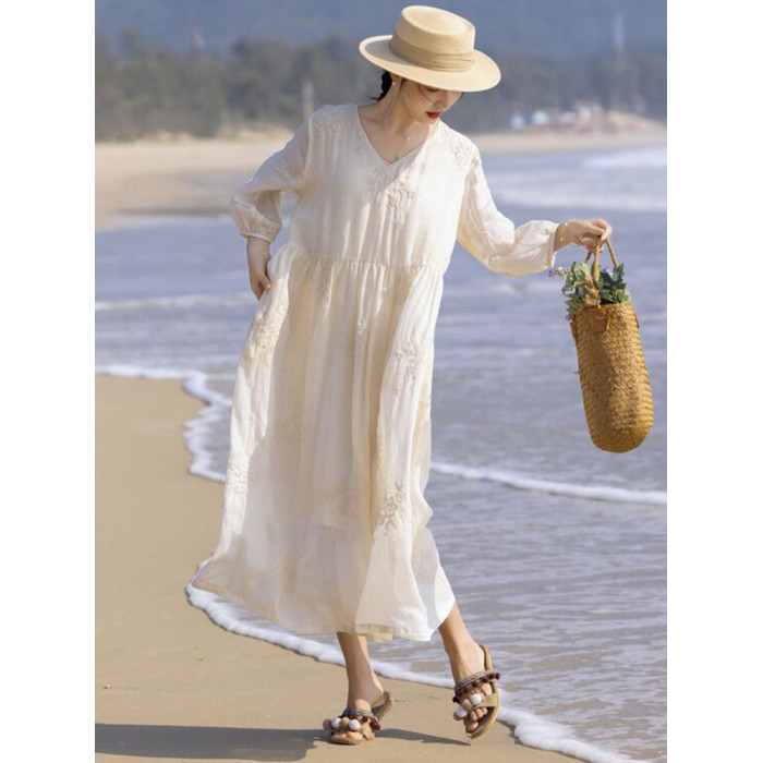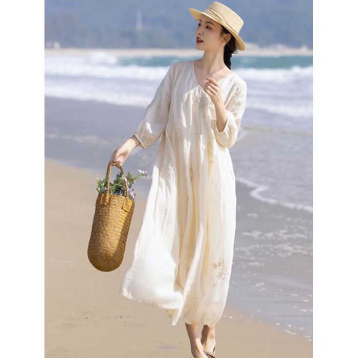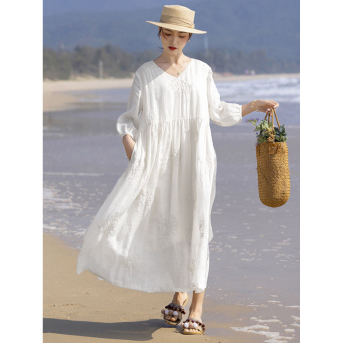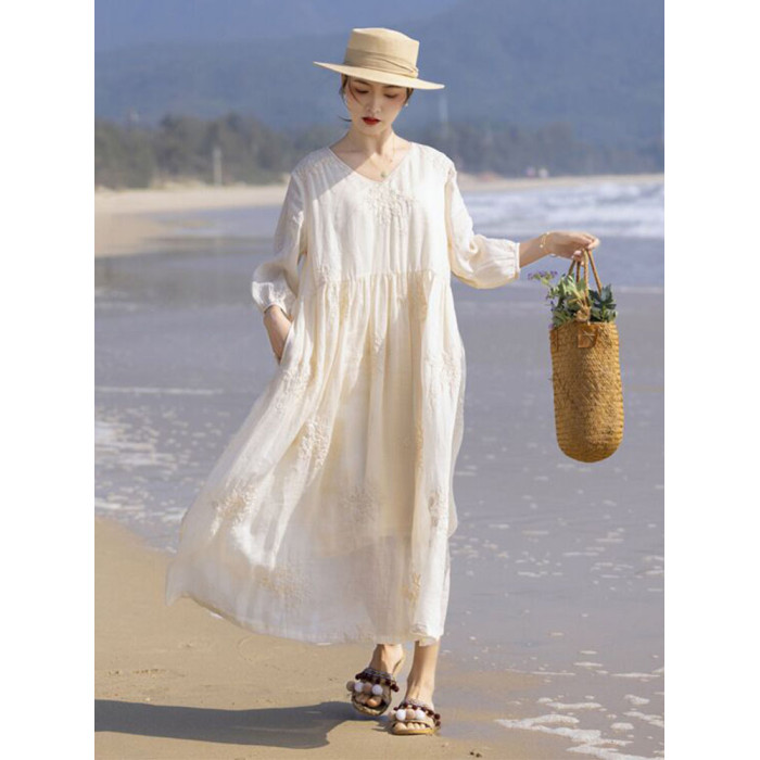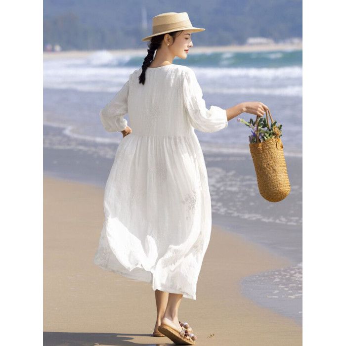 白色苧麻連衣裙女2025夏季 寬松重工刺綉七分袖V領海邊沙灘裙長裙