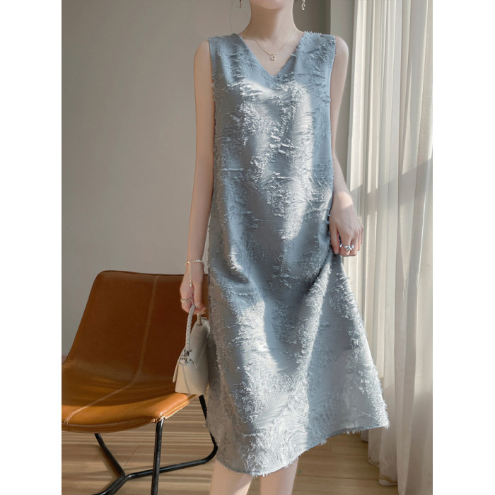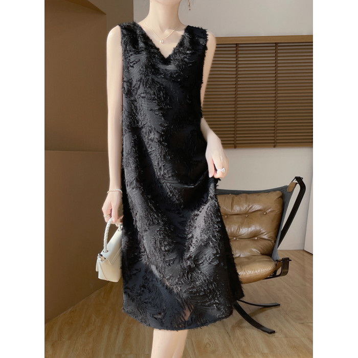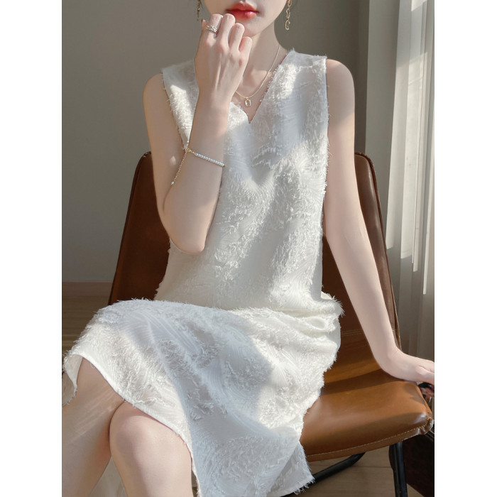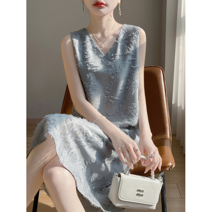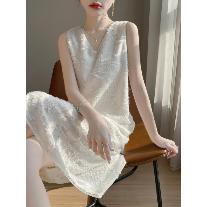 極簡重工流蘇剪花V領吊帶連衣裙女春夏寬松優雅無袖背心長裙高級