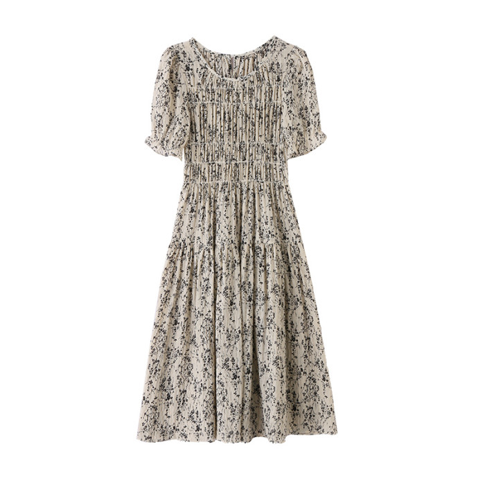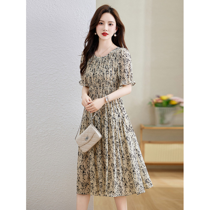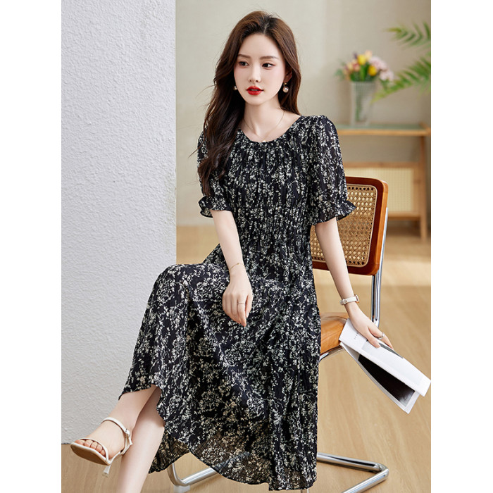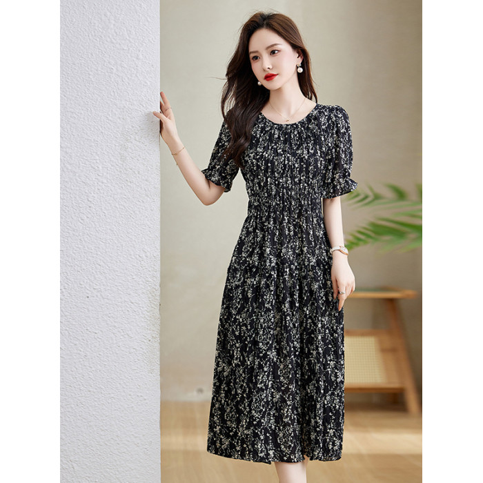 高級氣質真絲短袖連衣裙女夏季新款收腰中長款桑蠶絲小個子碎花裙
