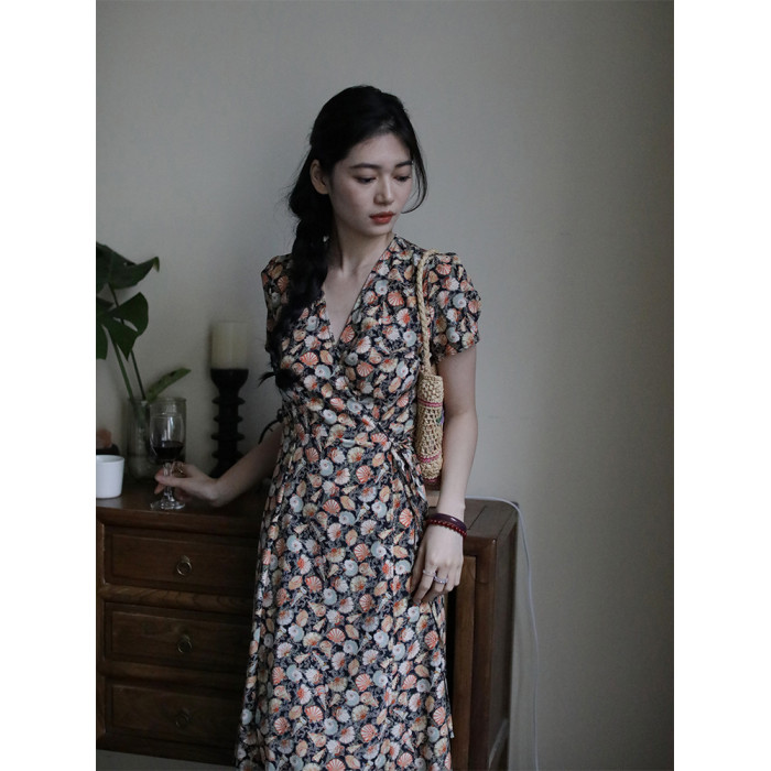 小泡芙日系春季新款女裝時尚立領碎花荷葉邊小飛袖百褶長款連衣裙