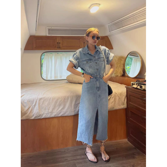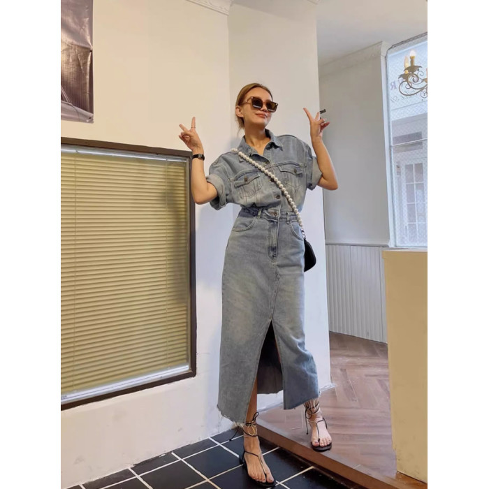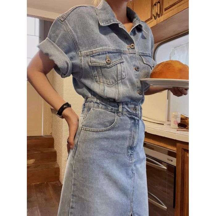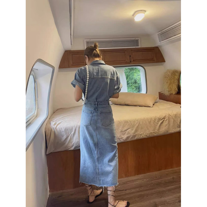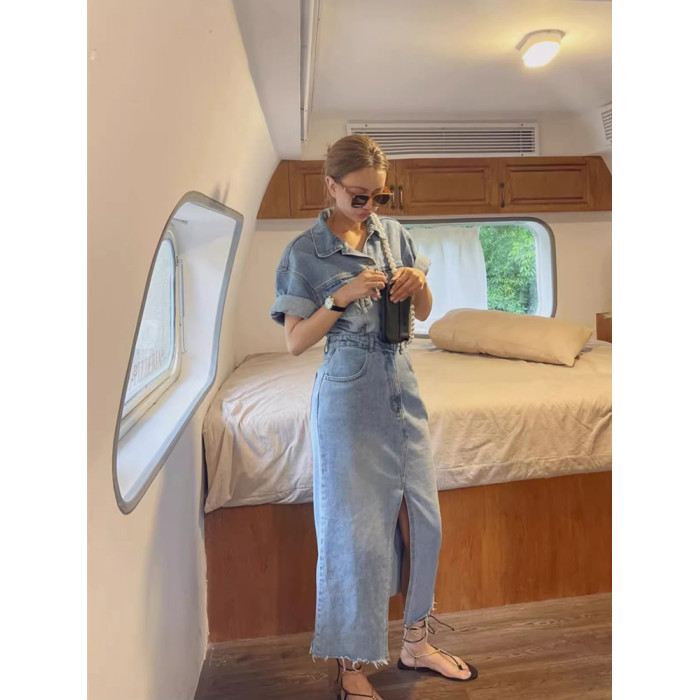韓版短袖修身顯瘦polo翻領收腰包臀過膝休閒牛仔連衣裙長裙女夏季