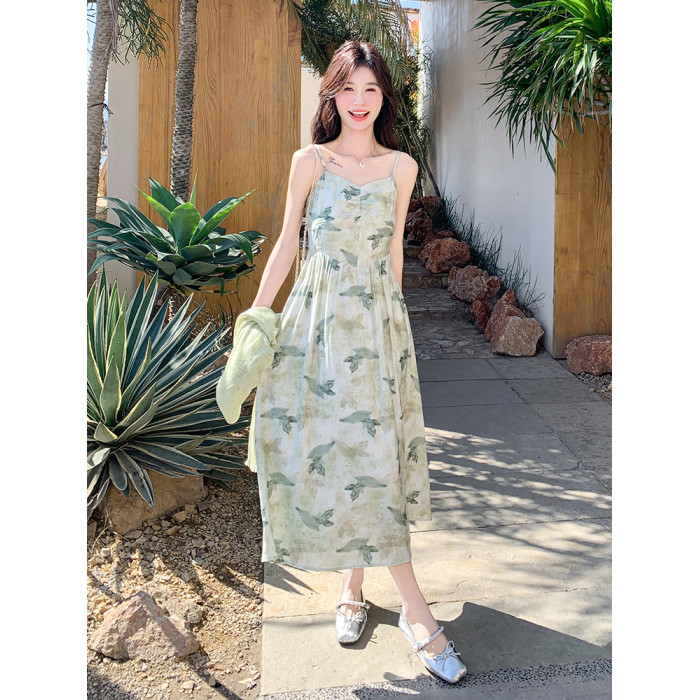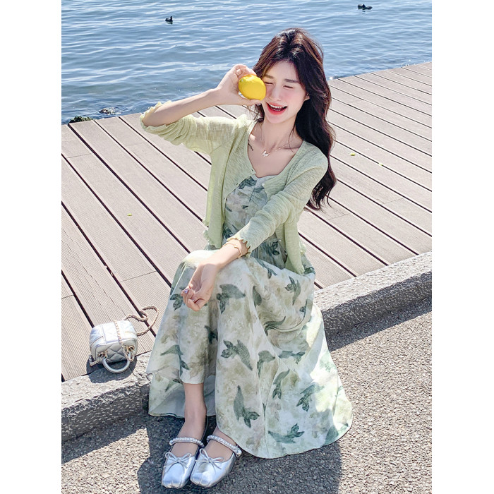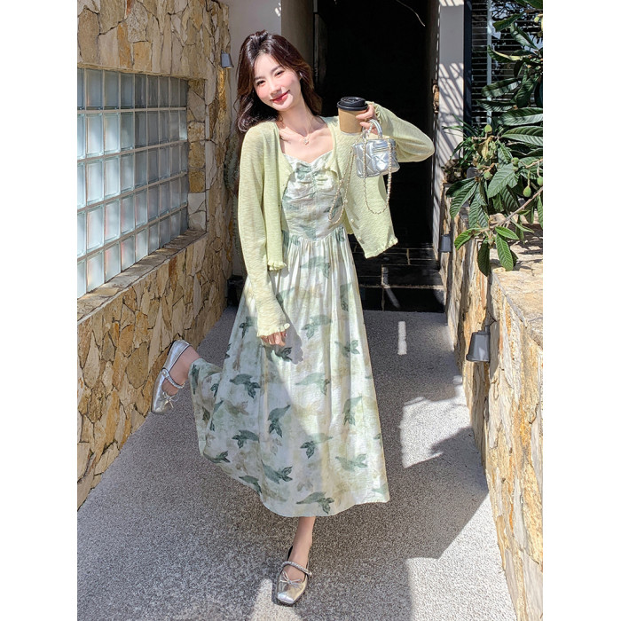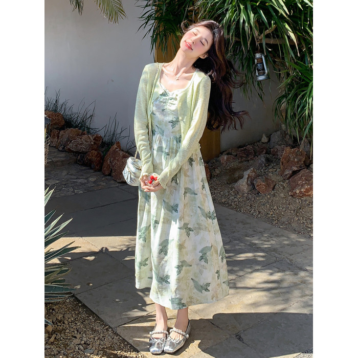薄荷曼波綠色碎花法式連衣裙女2025新款春夏針織開衫吊帶裙子套裝