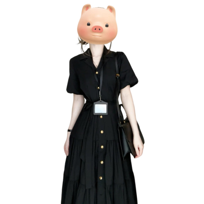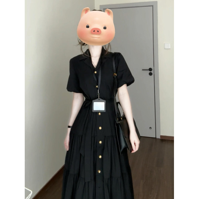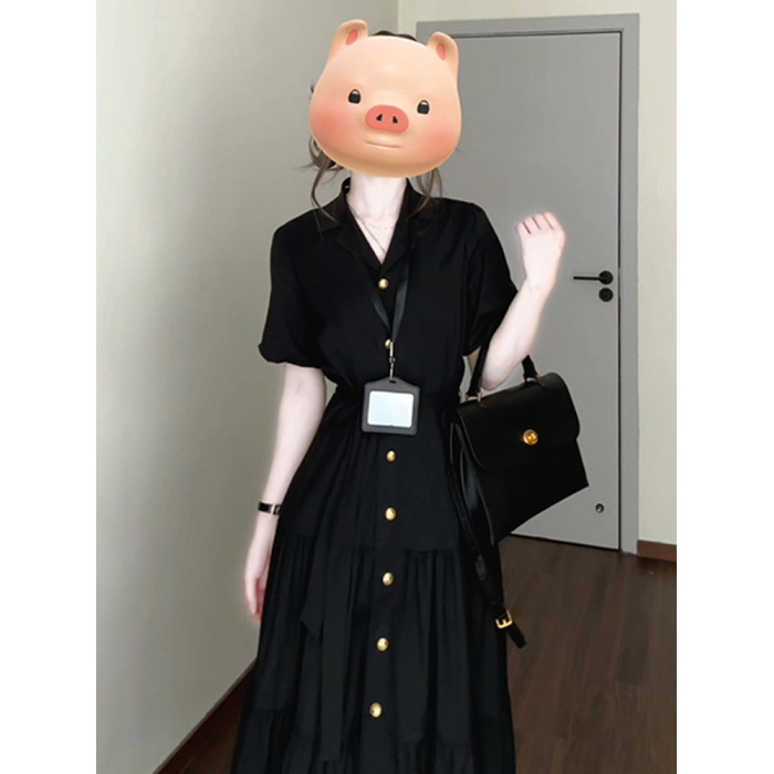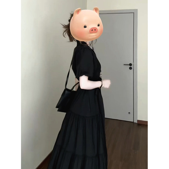 今年流行爆款黑色v領連衣裙子女夏裝2025新款夏季高級感收腰長裙