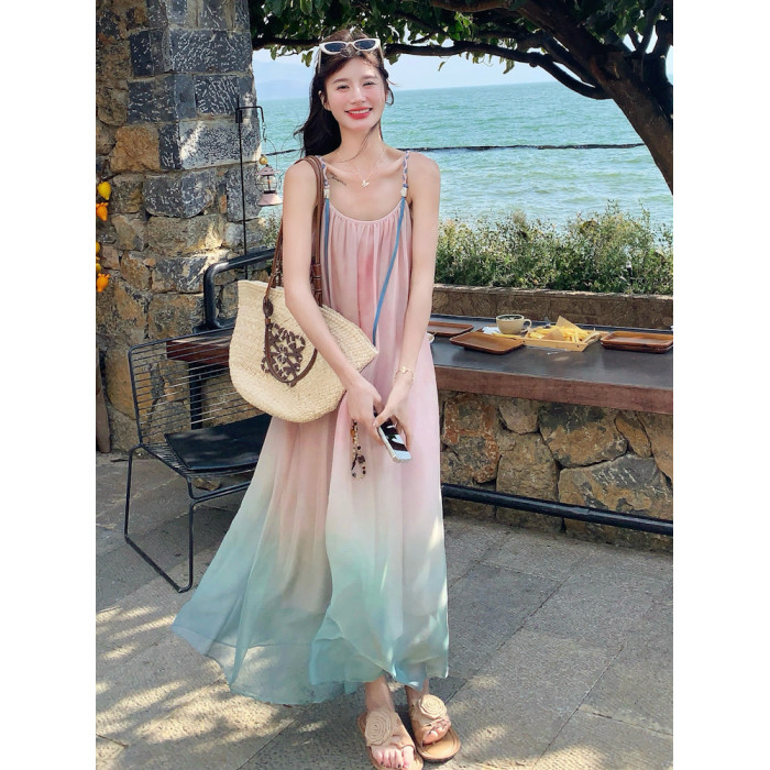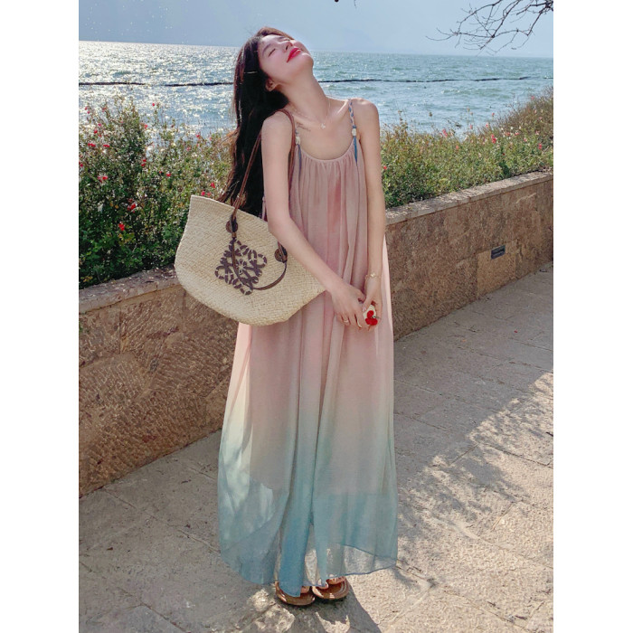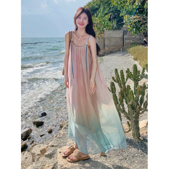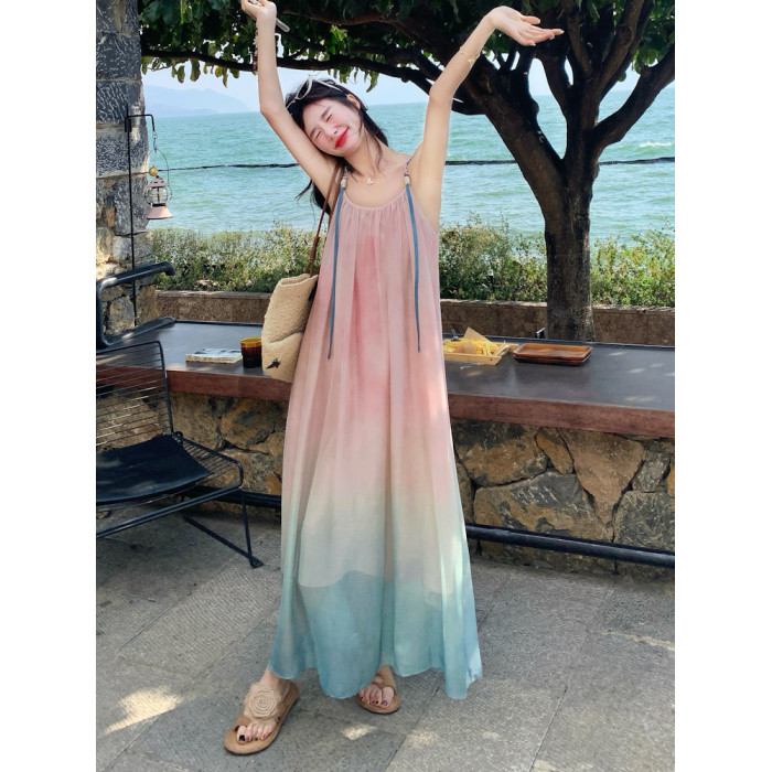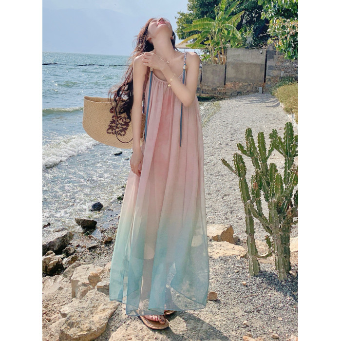 海邊度假漸變色暈染吊帶連衣裙女2025夏日絕美多巴胺超仙薄紗長裙