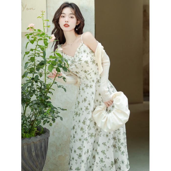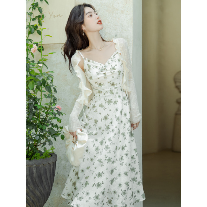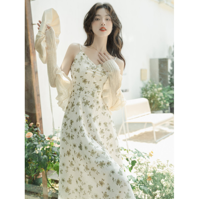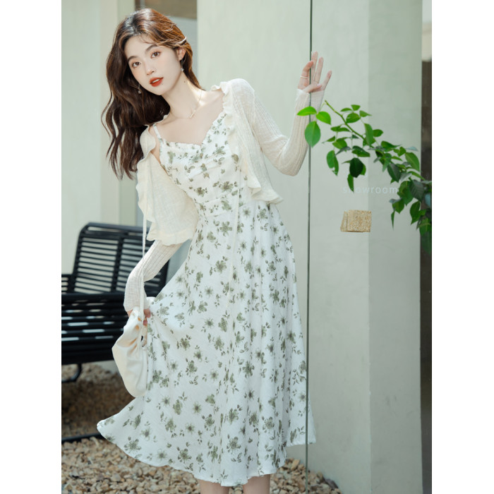 夏日絕美小裙子收腰顯瘦雪紡碎花吊帶連衣裙開衫溫柔森系穿搭套裝