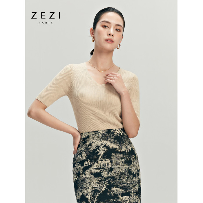zezi半袖V領T恤棉亞麻針織衫純色通勤打底衫女套頭修身通勤內搭