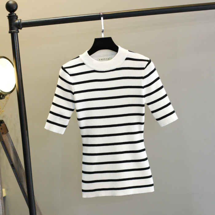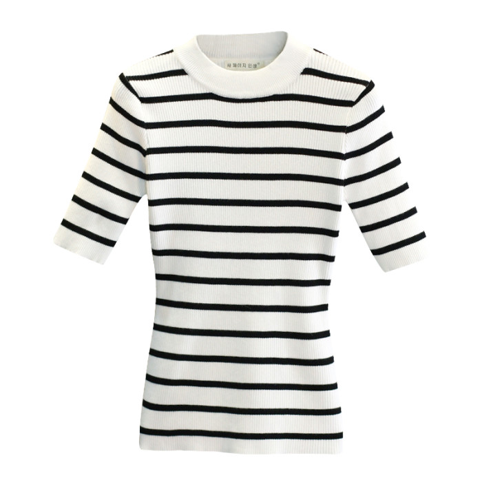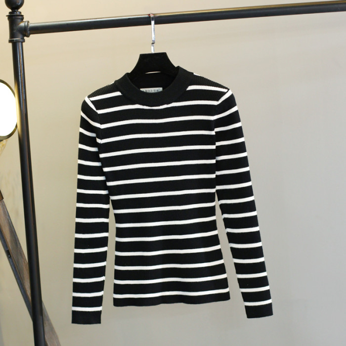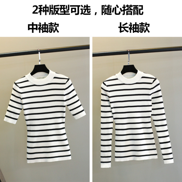黑白條紋針織衫上衣女長袖內搭修身薄款2023春秋半高領打底衫毛衣