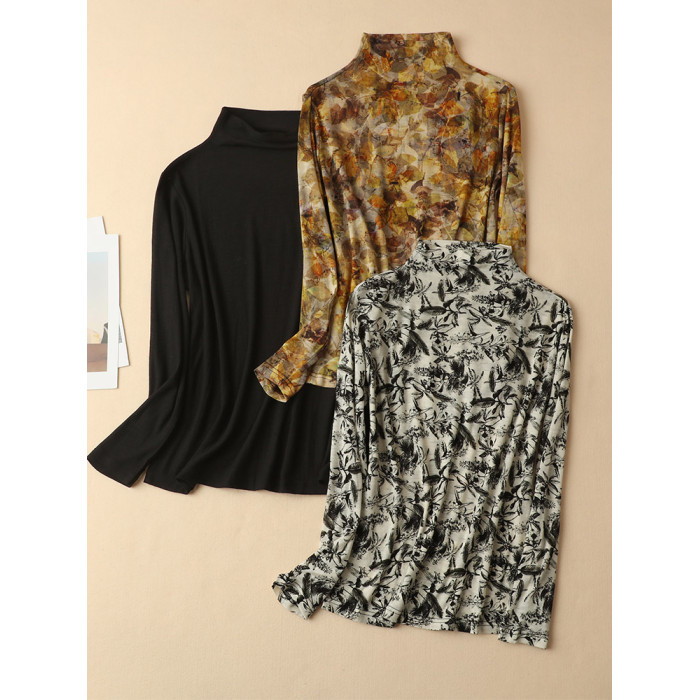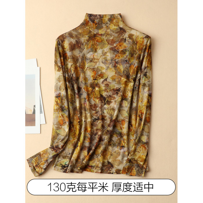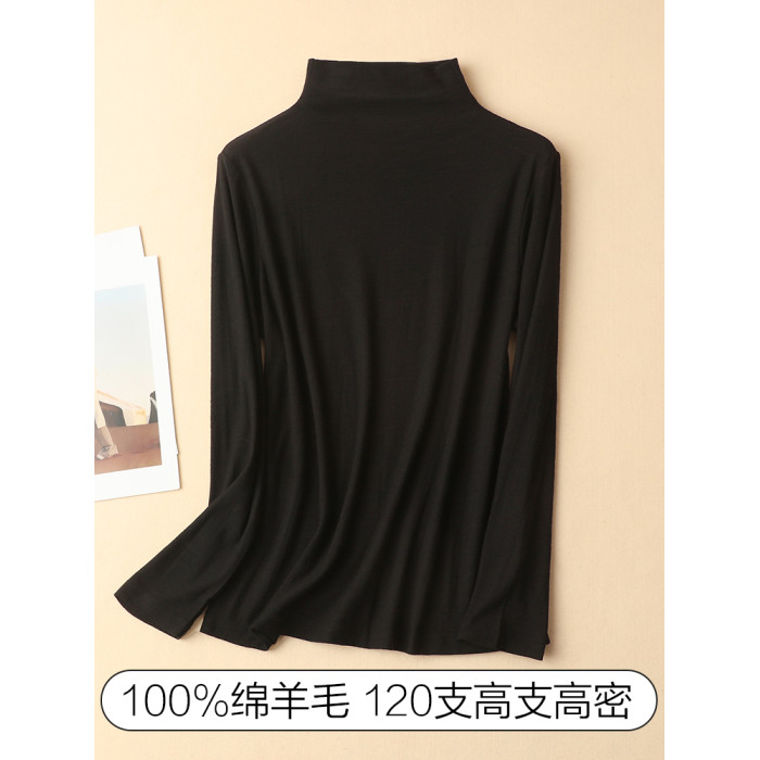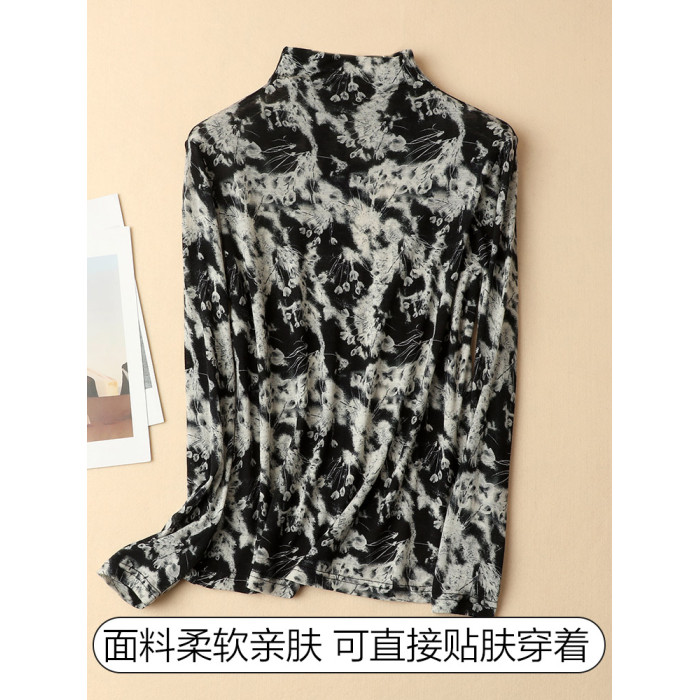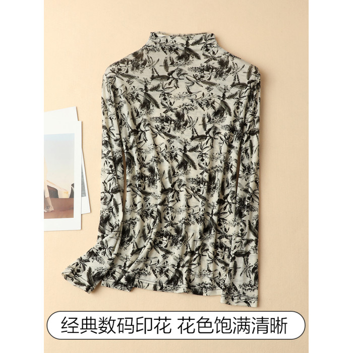 100%綿羊毛細膩自由領半高領長袖打底衫印花時尚可外穿女裝春秋薄