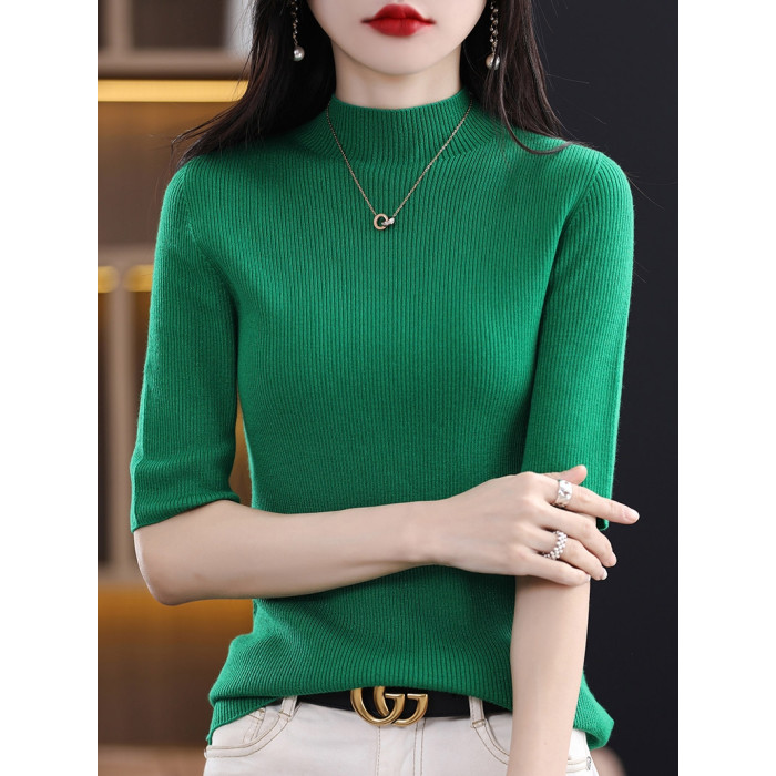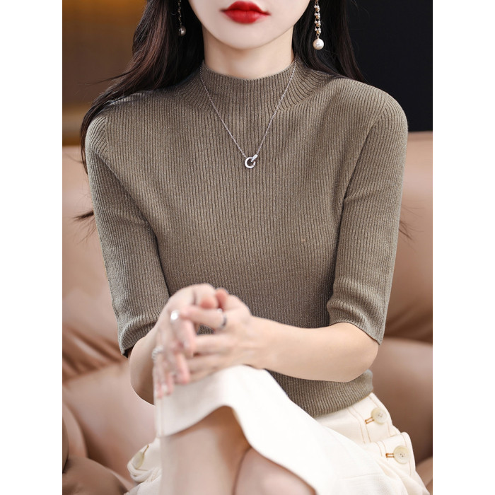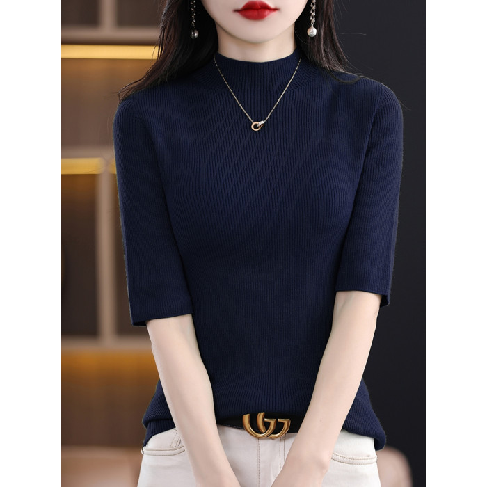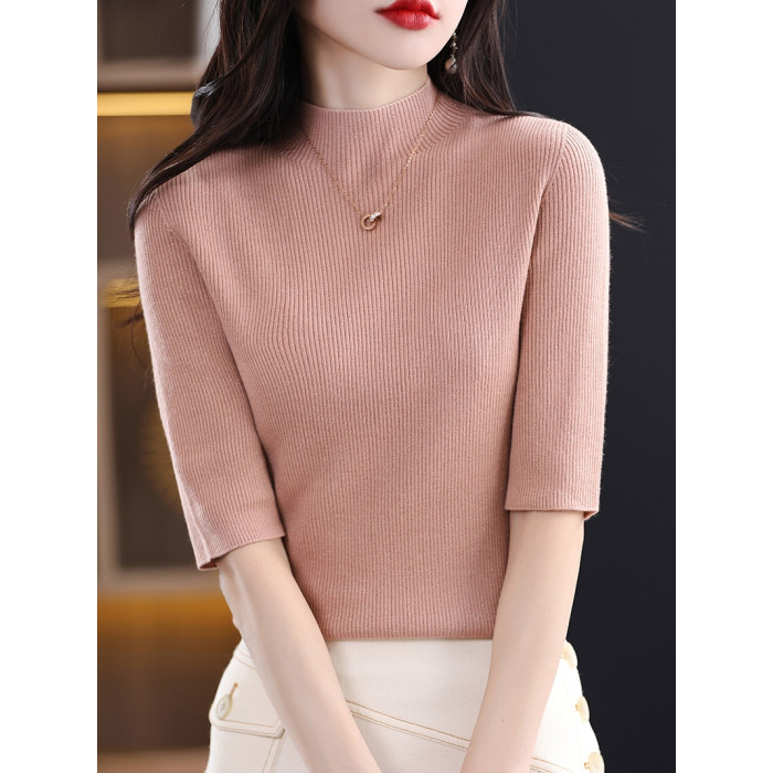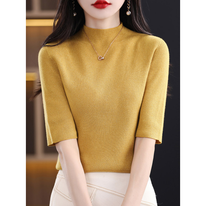 半高領五分袖打底衫女修身顯瘦中袖配西裝內搭春秋新款半袖針織衫