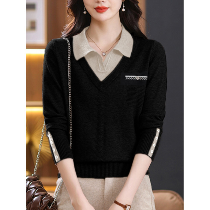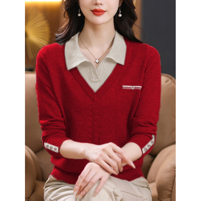 春裝2025新款毛衣假兩件襯衫領針織衫時尚百搭顯瘦上衣春秋打底衫