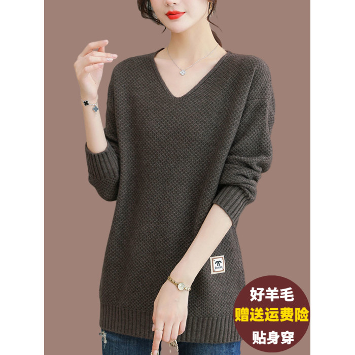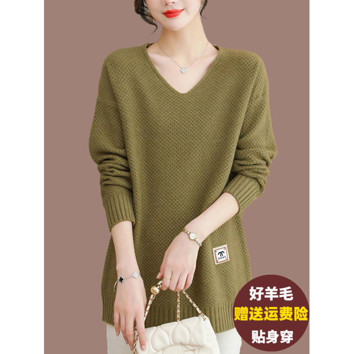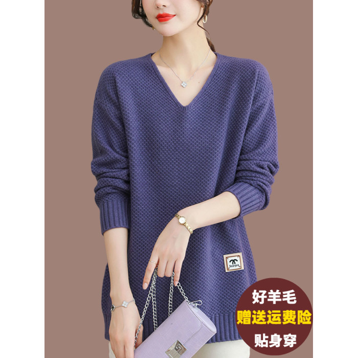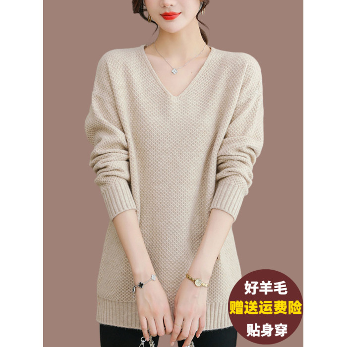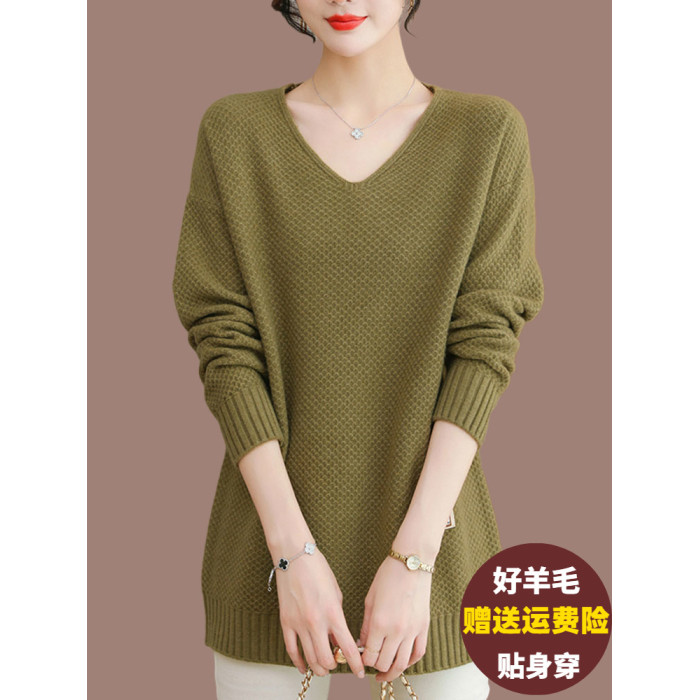 V領中長款毛衣女外穿遮肚顯瘦羊毛衫寬松大碼內搭羊絨針織打底衫