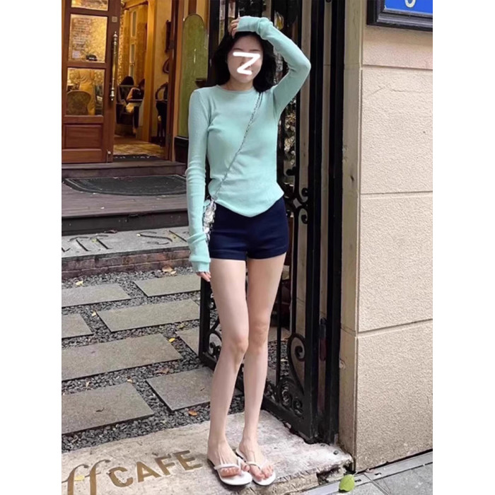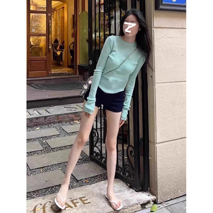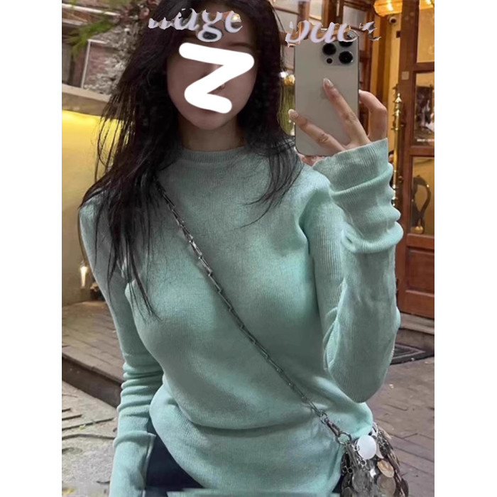 2025春秋新款圓領長袖針織衫女法式高級感薄款修身純色內搭打底衫