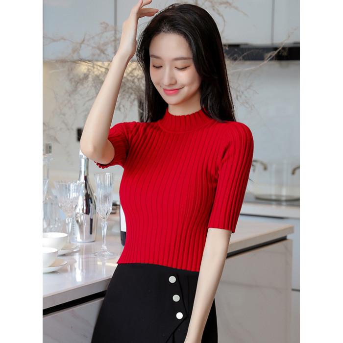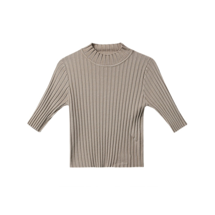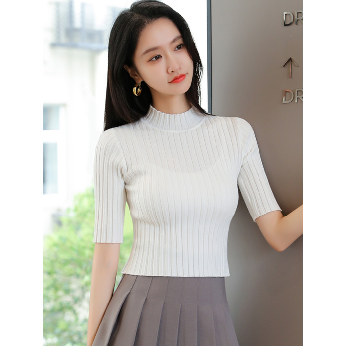 中領薄款針織衫女五分袖秋季小個子上衣短款高腰內搭半高領打底衫
