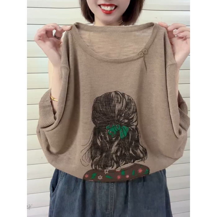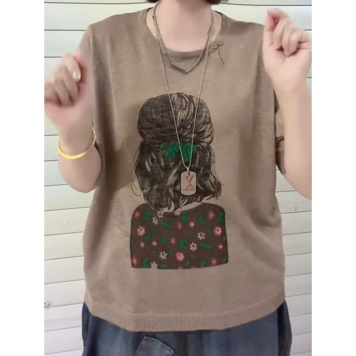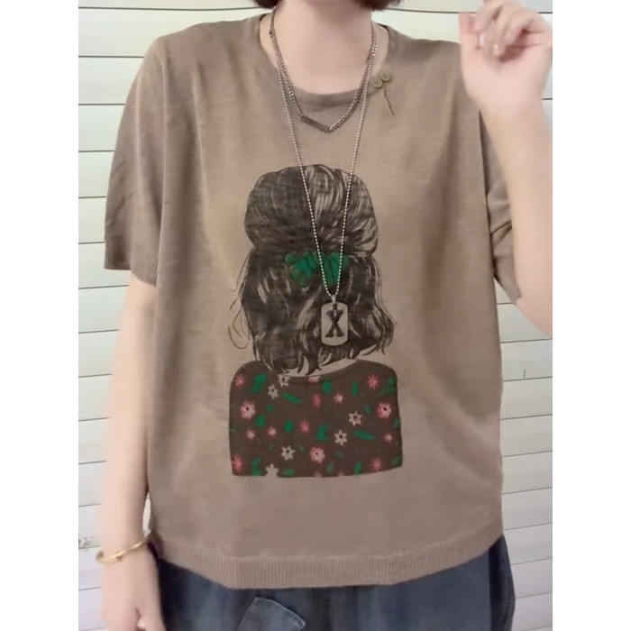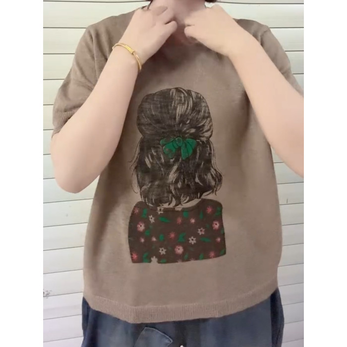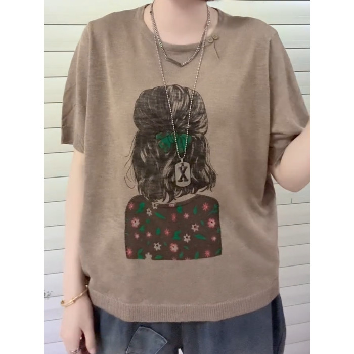 夏季新款圓領短袖針織衫女文藝休閒印花寬松百搭亞麻冰絲打底衫潮