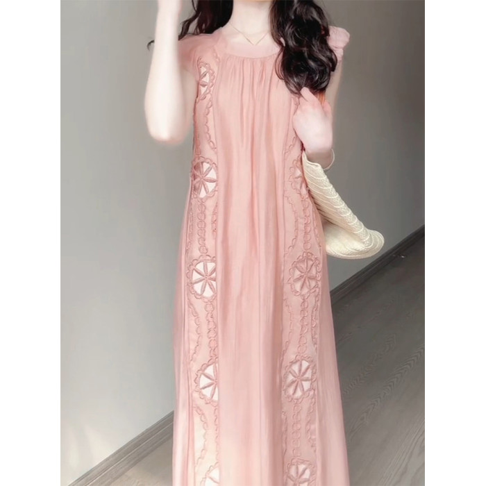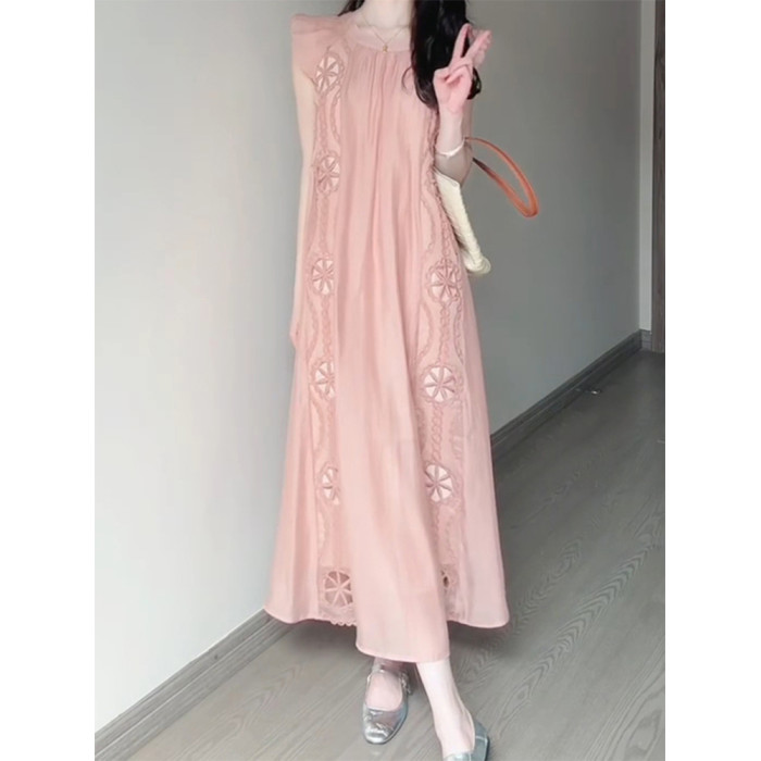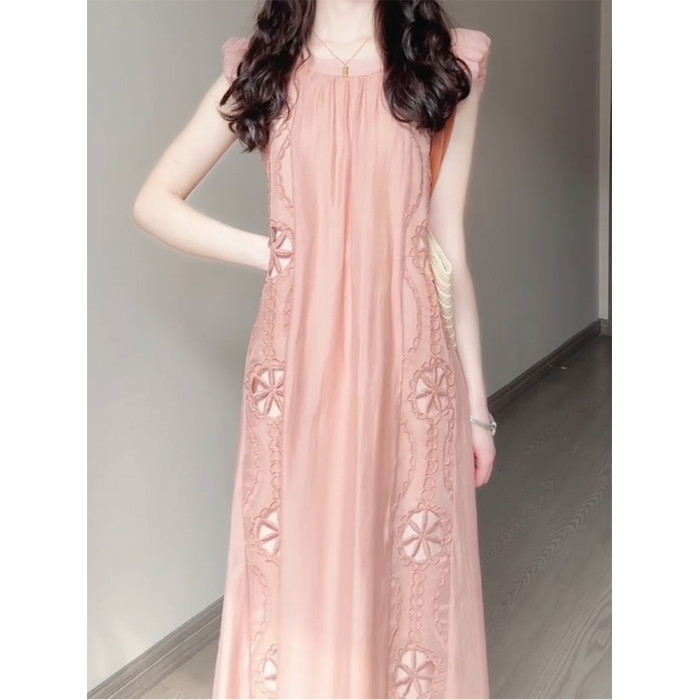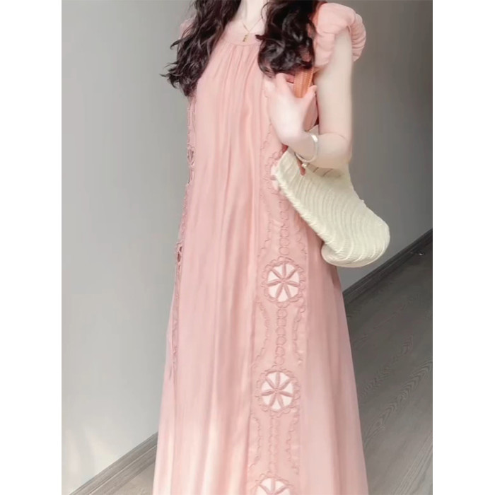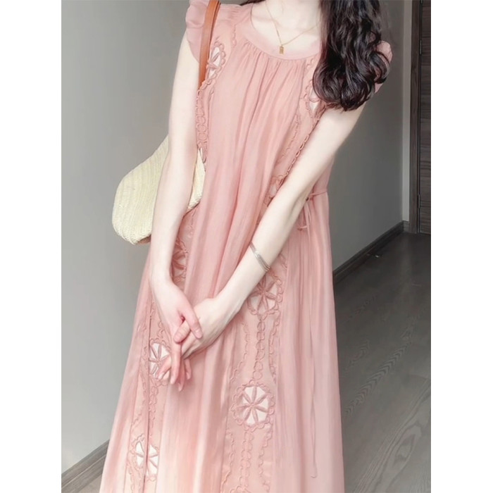 茶歇法式粉色刺綉鏤空小飛袖連衣裙海邊度假漂亮獨特氣質長裙夏季
