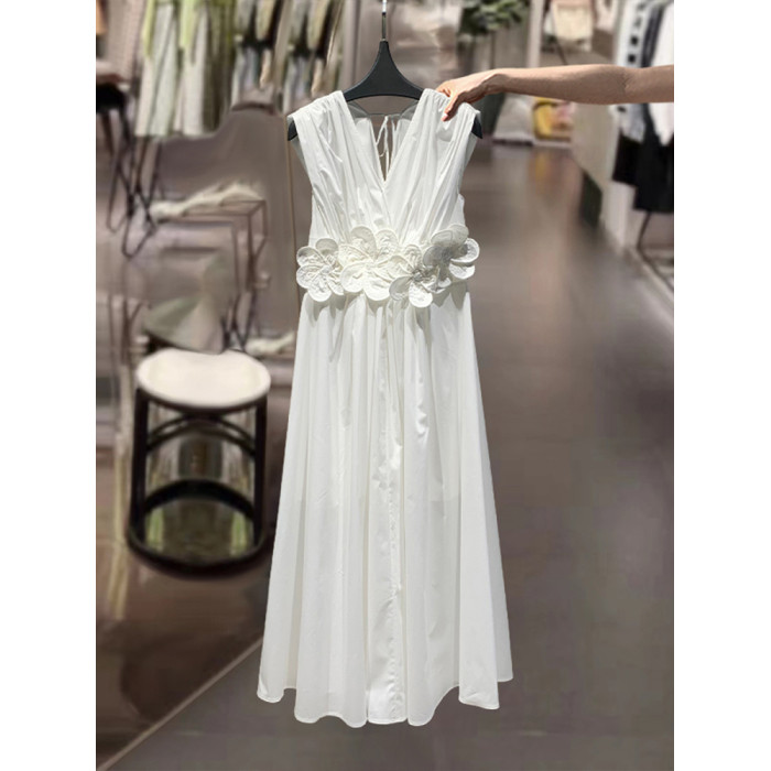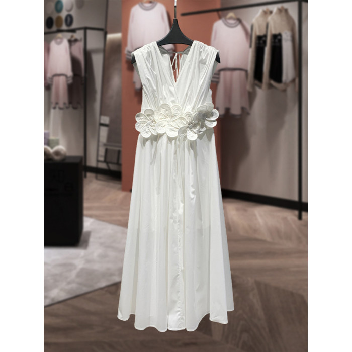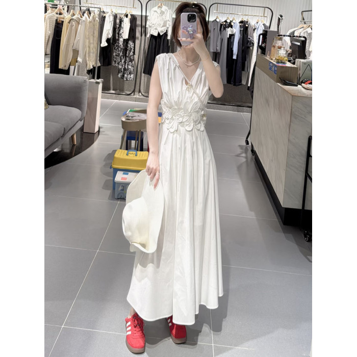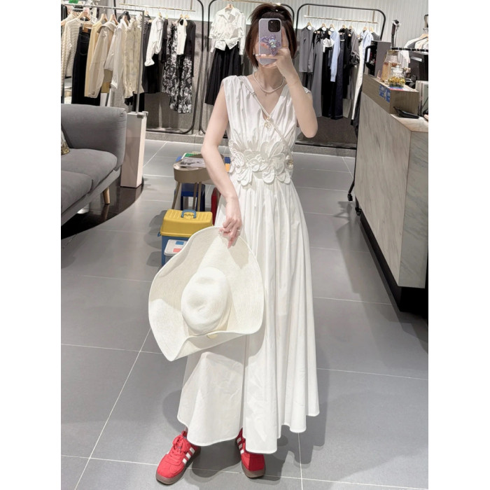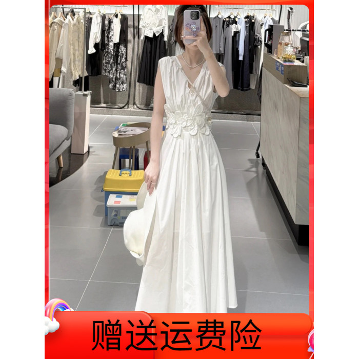 米白色立體花朵精緻重工洋氣無袖連衣裙女2025夏新款長款A字裙