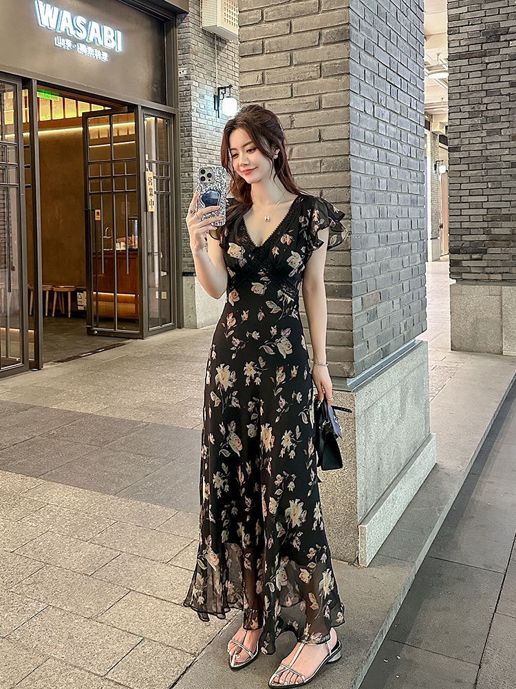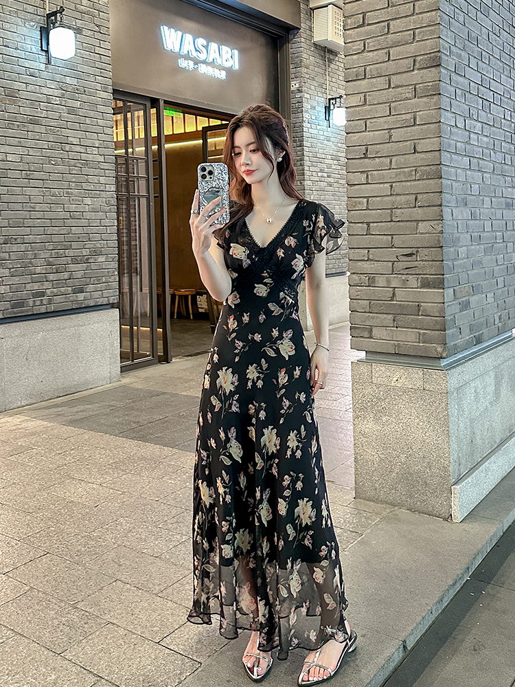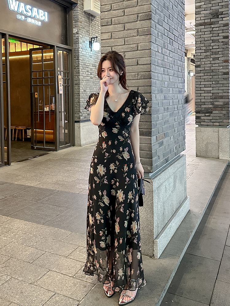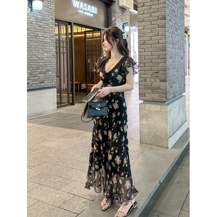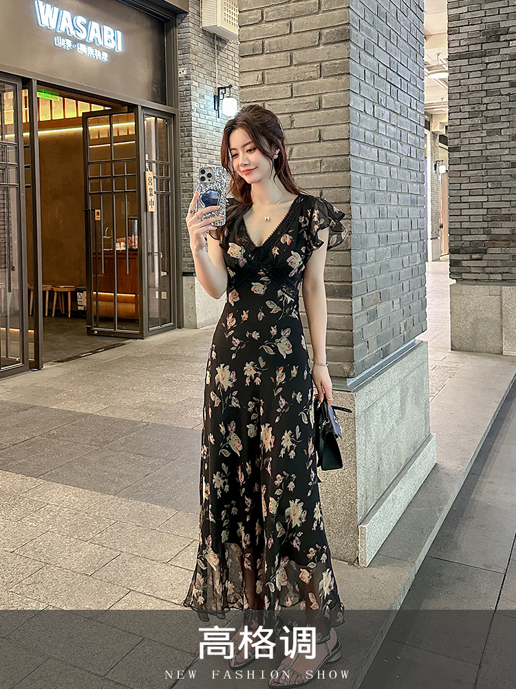 v領碎花連衣裙女2025夏季新款海邊度假風修身收腰氣質雪紡長裙子
