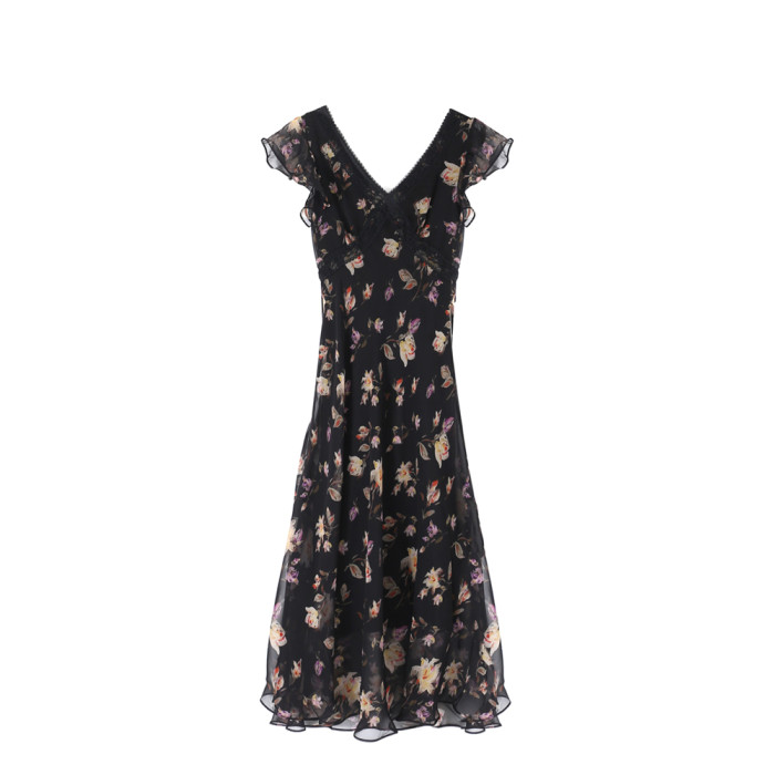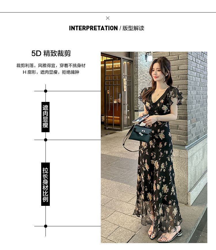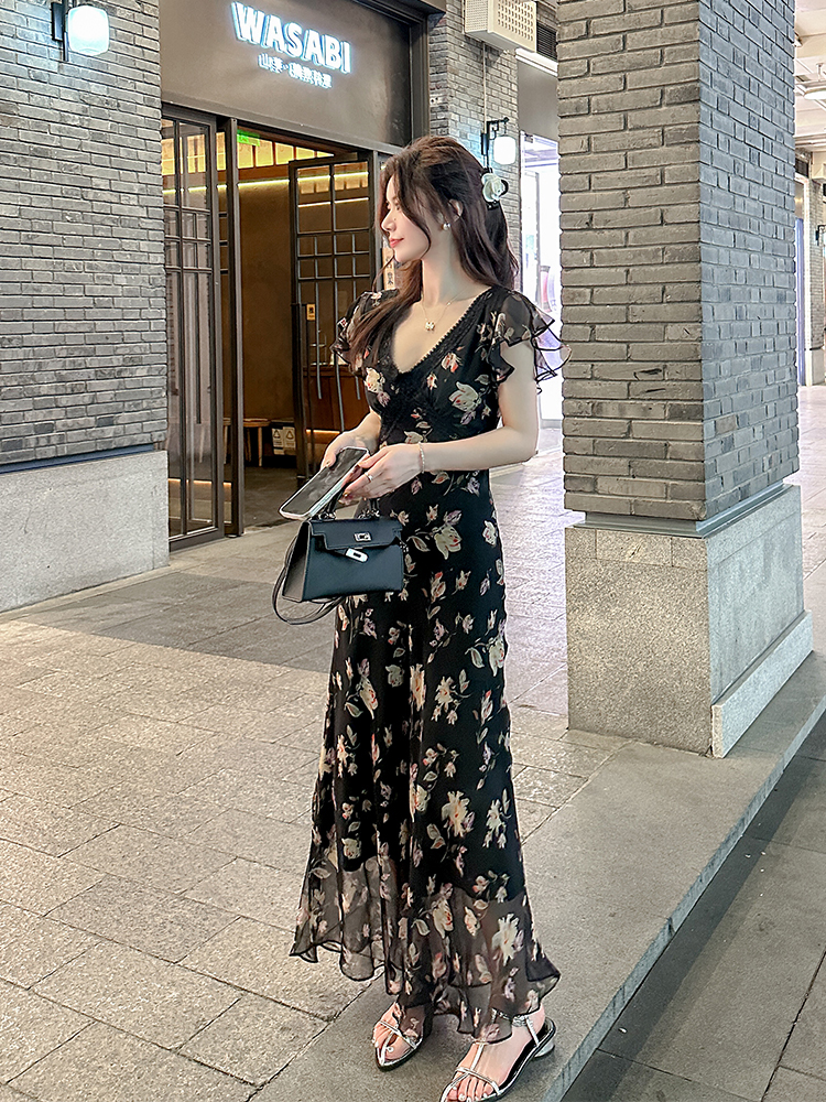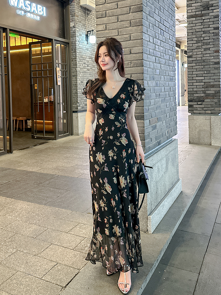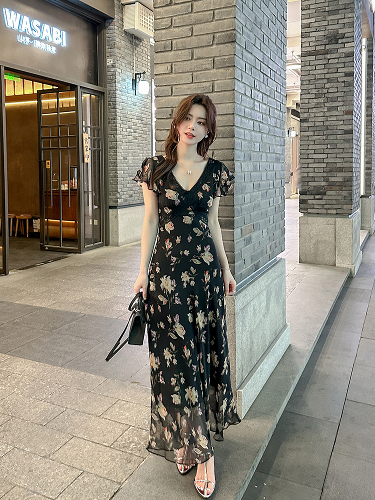 v領碎花連衣裙女2025夏季新款海邊度假風修身收腰氣質雪紡長裙子