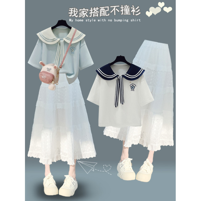 少女海軍領洋氣連衣裙2025夏裝初中生套裝裙高中學生時尚女孩裙子