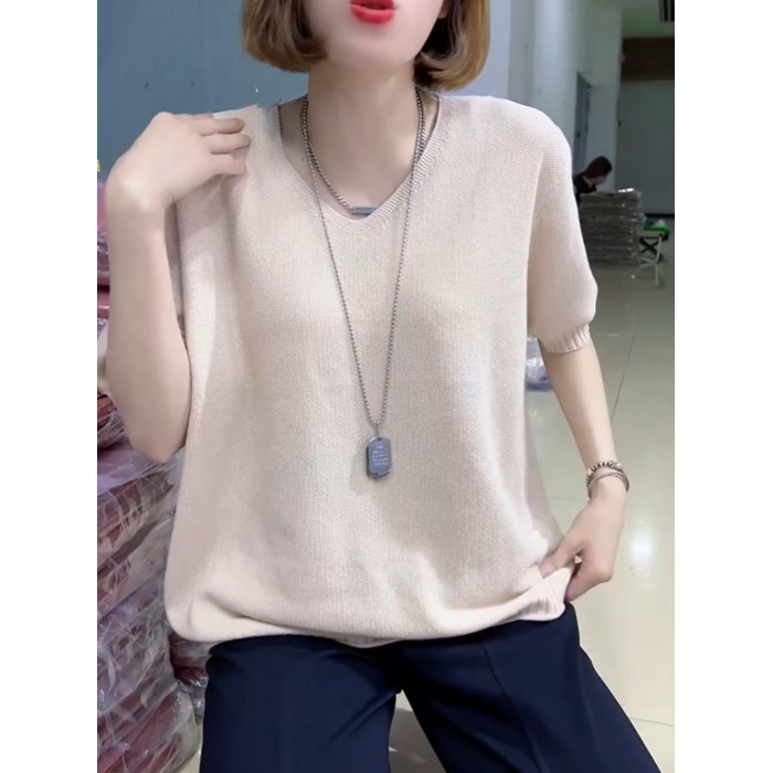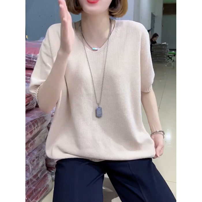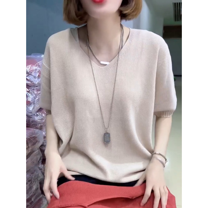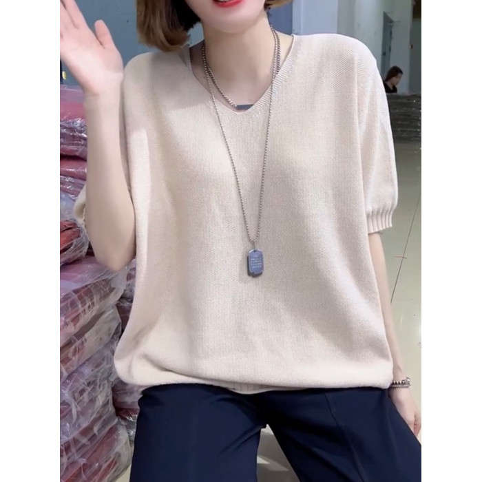 歐貨夏季純色V領短袖針織打底衫女寬松簡約套頭純棉線內搭半袖女