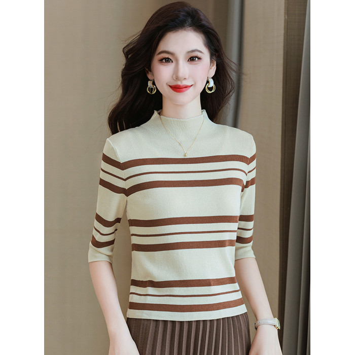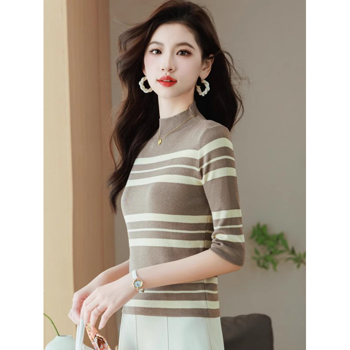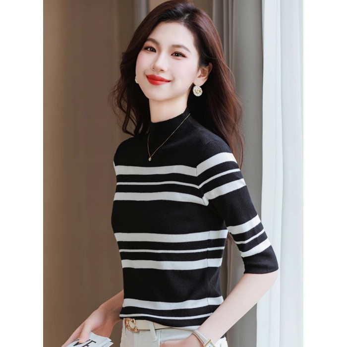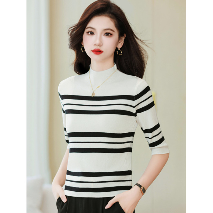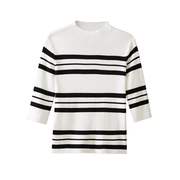 中袖條紋針織衫春季小個子氣質短款上衣女高級感半高領內搭打底衫