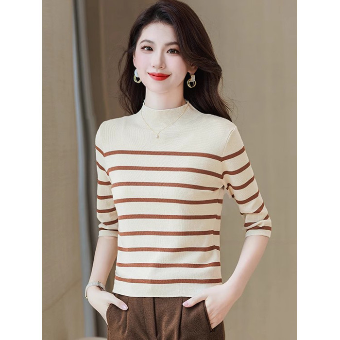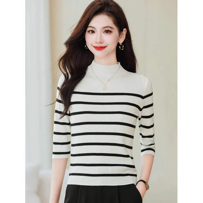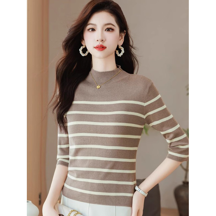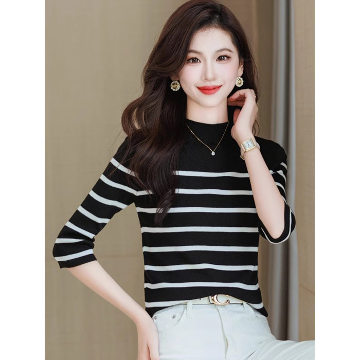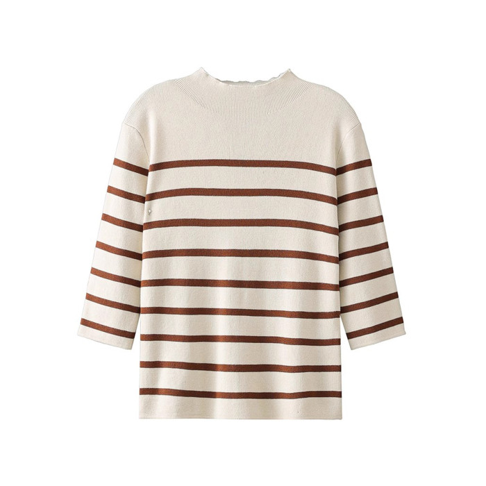 半高領條紋針織衫女春小個子短款上衣時尚洋氣修身內搭中袖打底衫