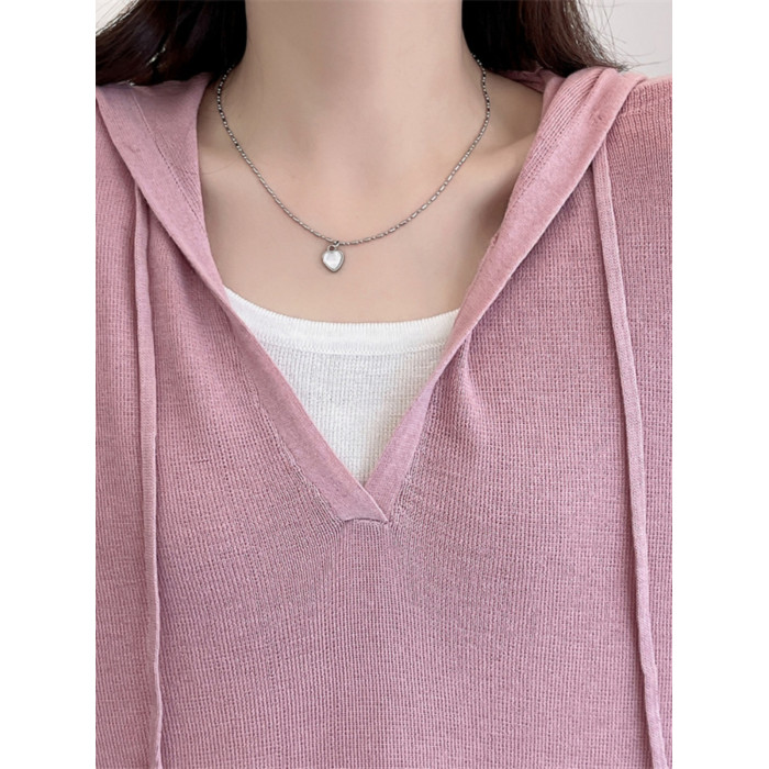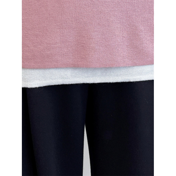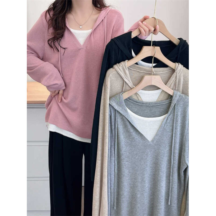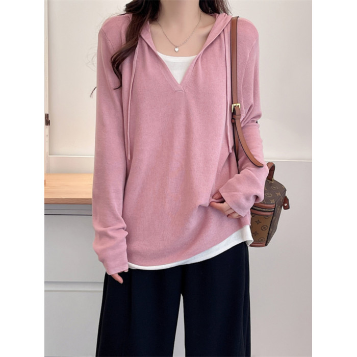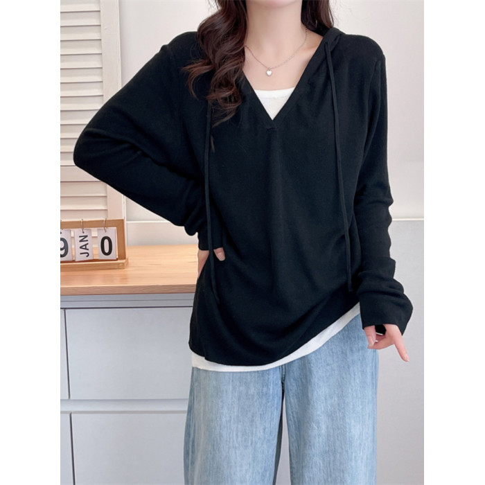 韓版假兩件連帽長袖打底衫春秋大碼新款洋氣寬松針織衫內搭上衣