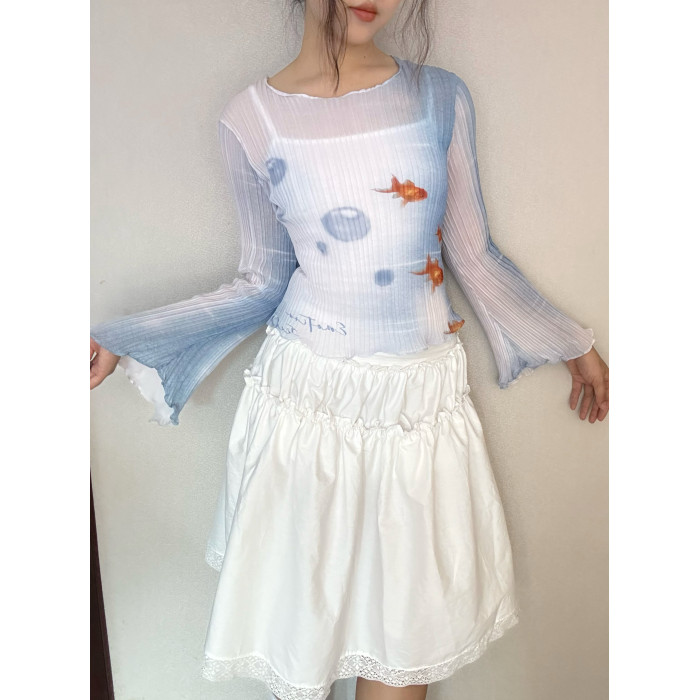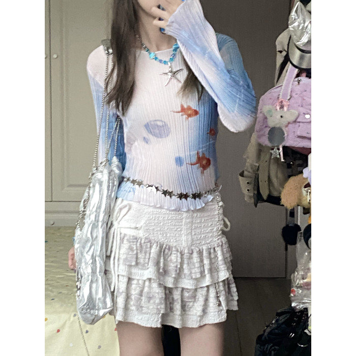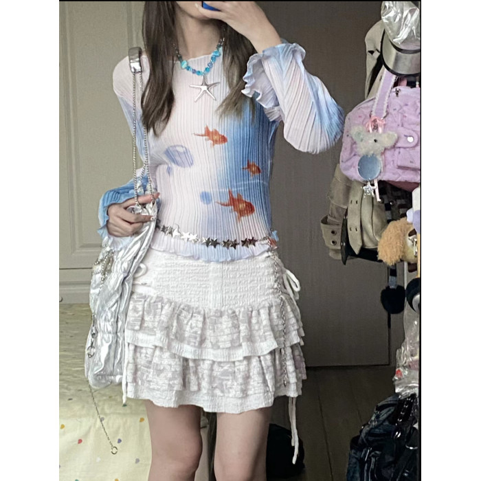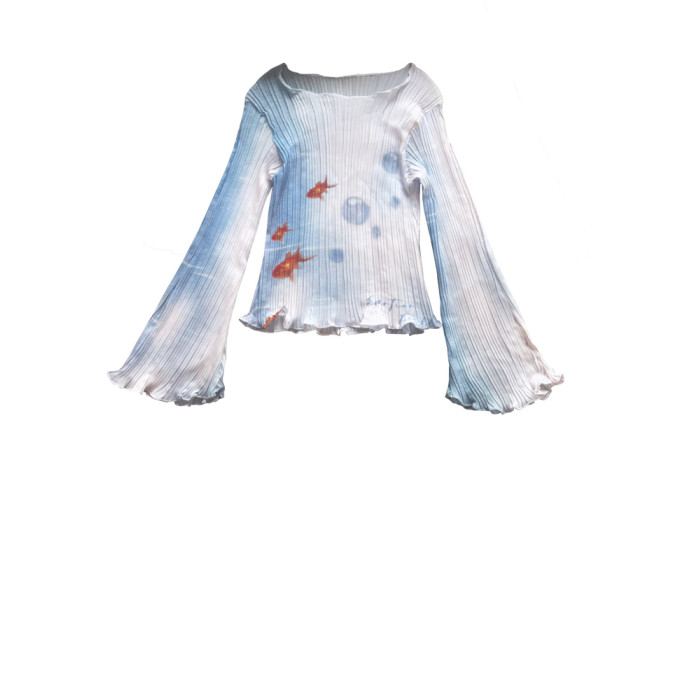 情緒磁場24FW汽水小魚上衣壓褶長袖防曬金魚設計印花四季打底衫