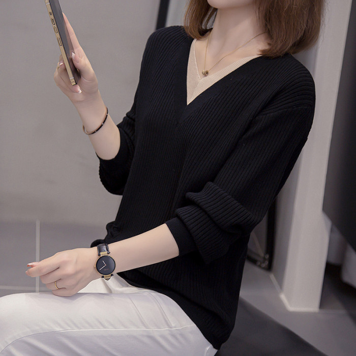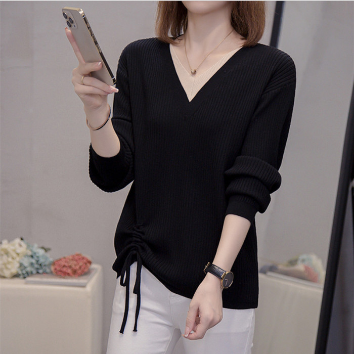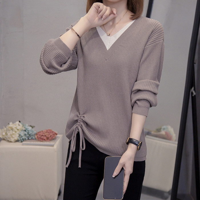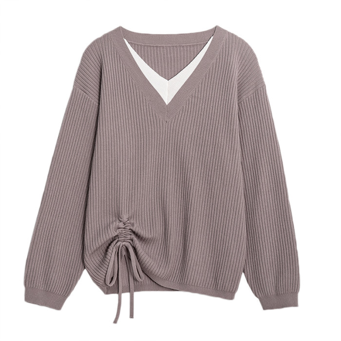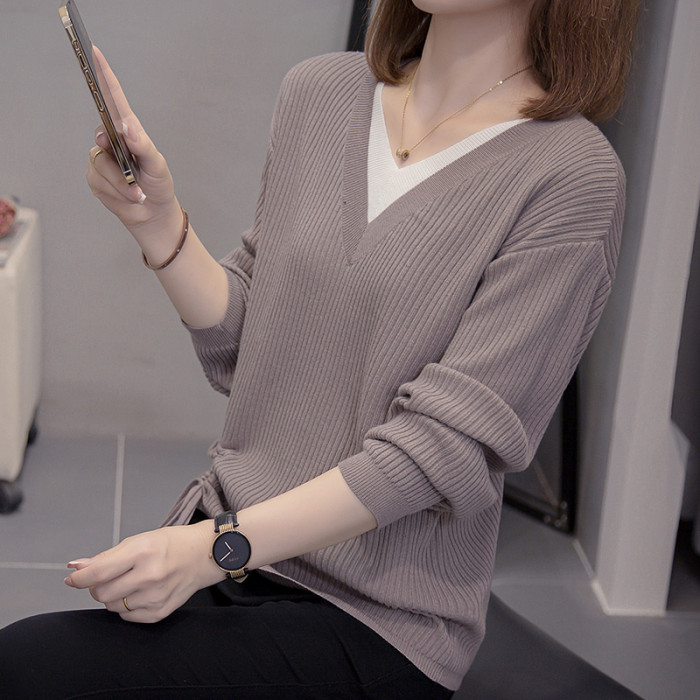 遮肉顯瘦v領假兩件針織上衣女秋冬毛衣設計感減齡長袖內搭打底衫