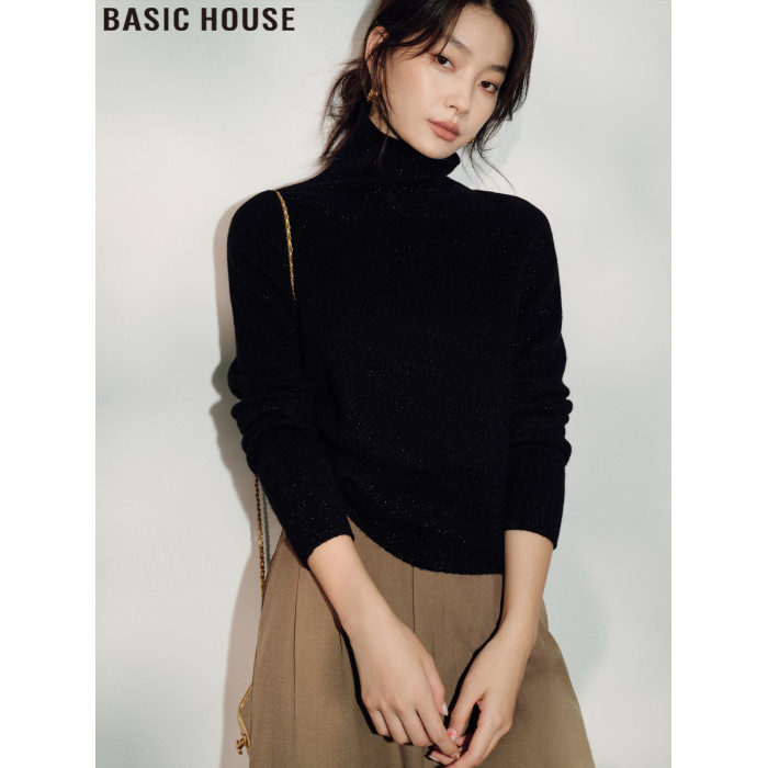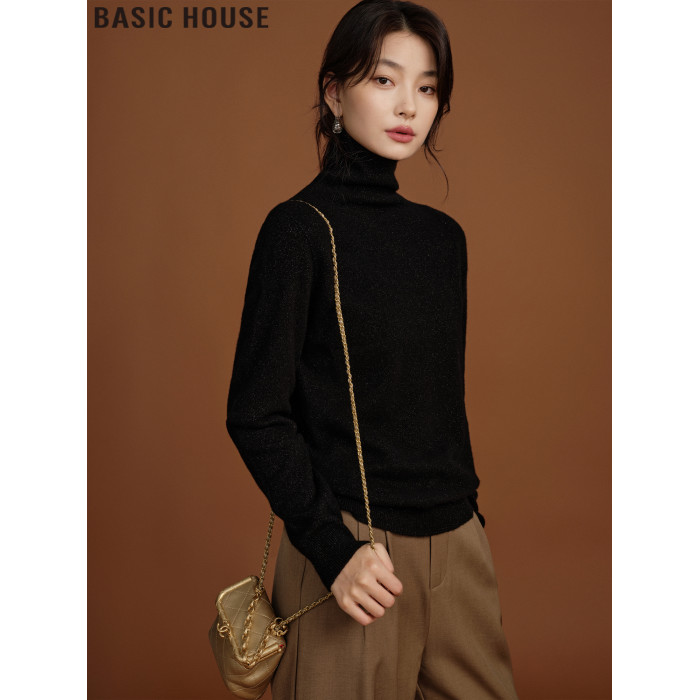 Basic House/百家好黑色修身高領羊毛針織打底衫上衣女2025年秋冬
