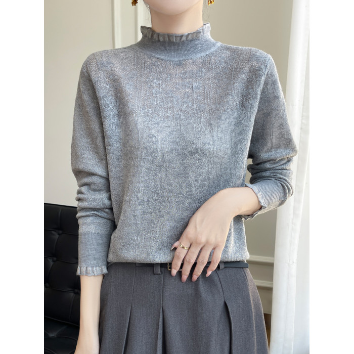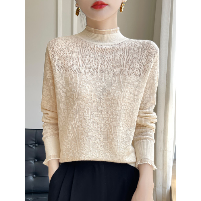 法式甜美蕾絲鉤花長袖針織打底衫女半高領毛衣寬松外穿木耳領上衣