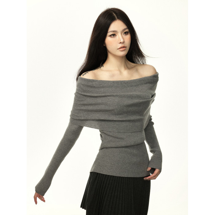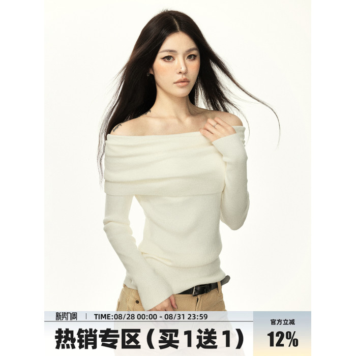 Aaisup 辣妹一字露肩針織打底衫女2025春秋新款修身顯瘦白色毛衣