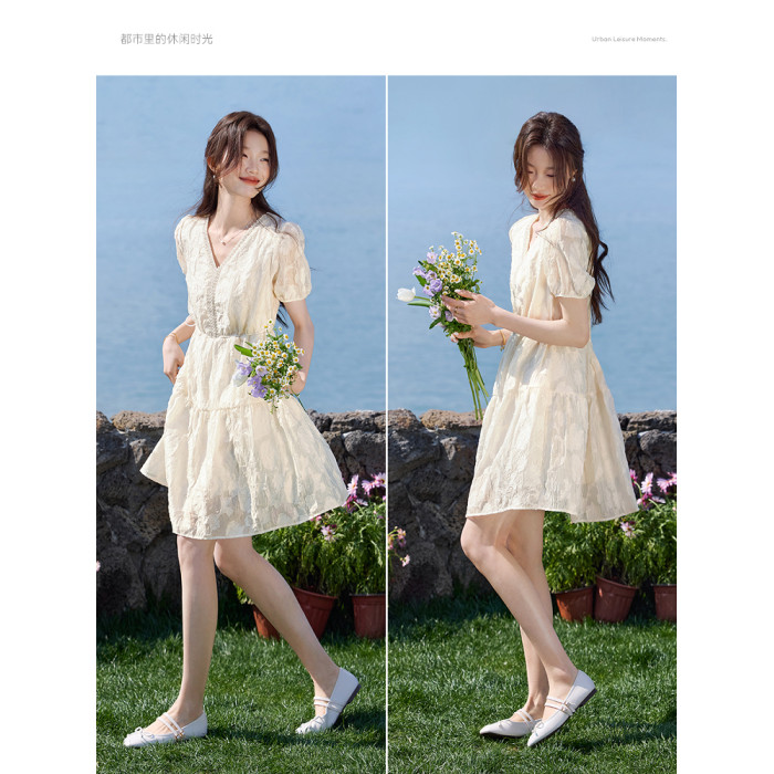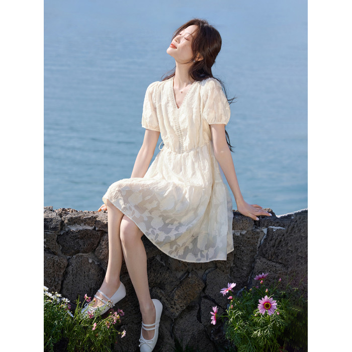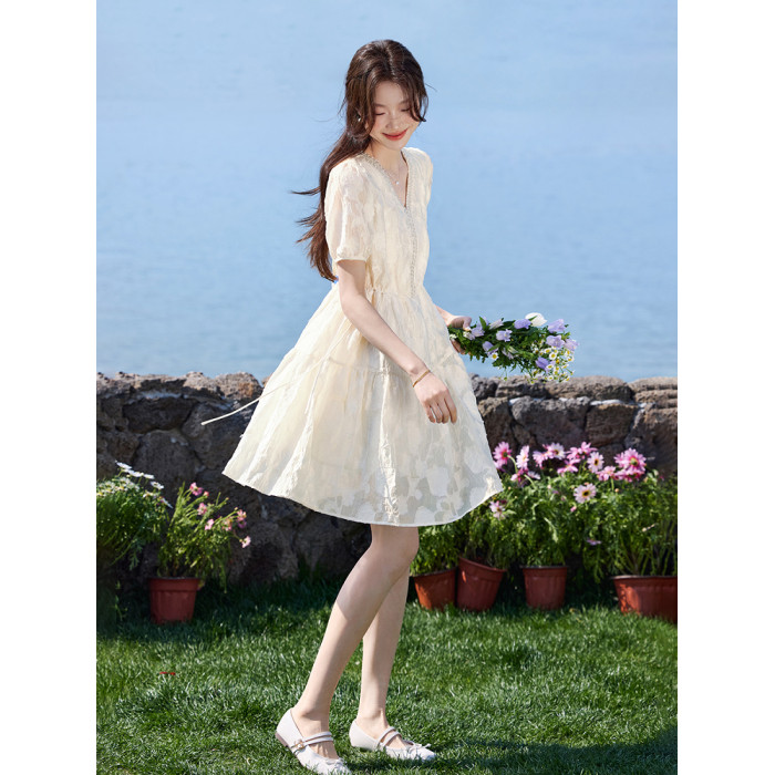 沫晗依美巨好看的白色裙子2025夏季新款法式千金感抽繩系帶連衣裙