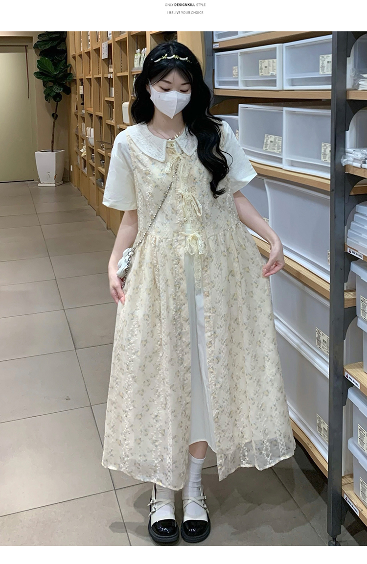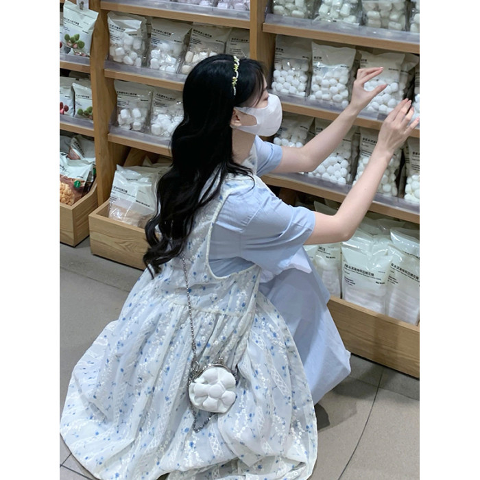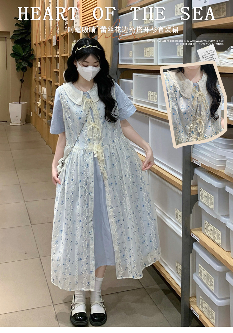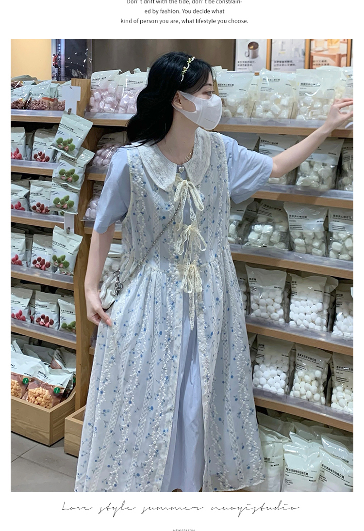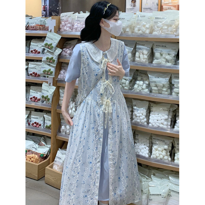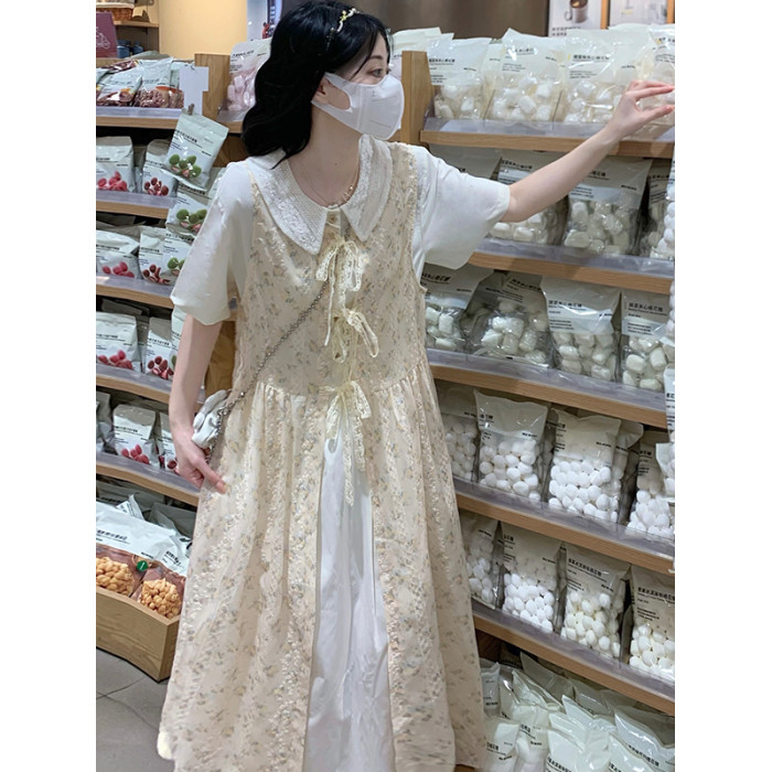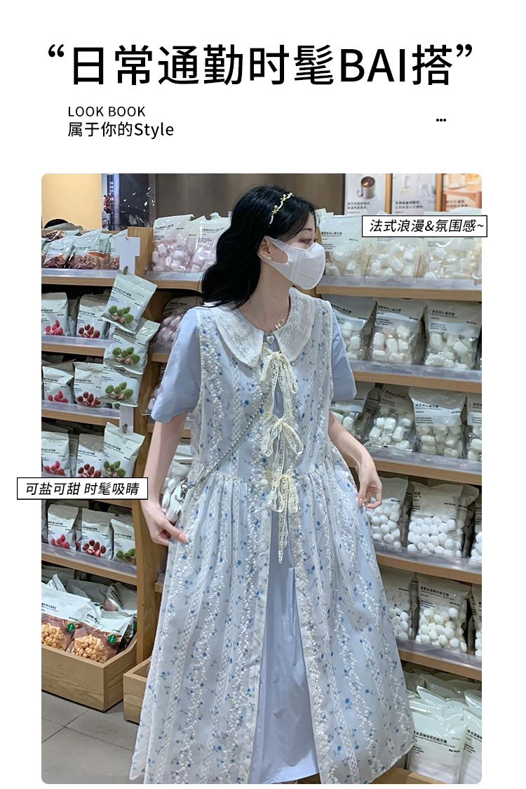 森女甜美部落2025夏季小清新套裝裙小衆短袖連衣裙罩衫曡穿兩件套