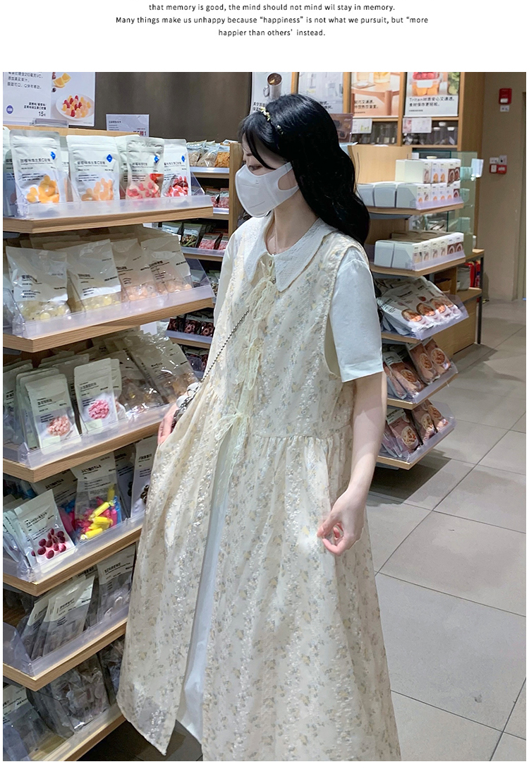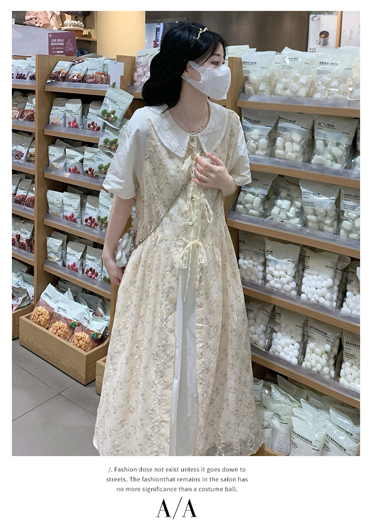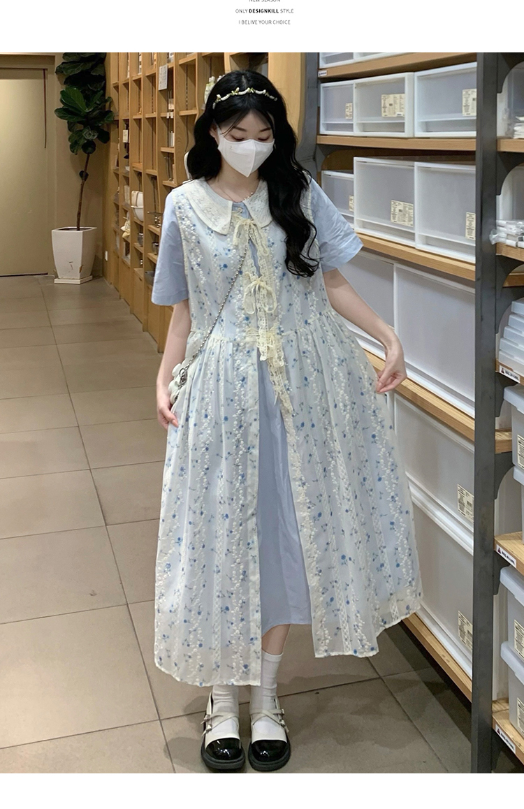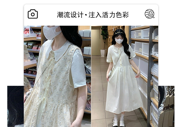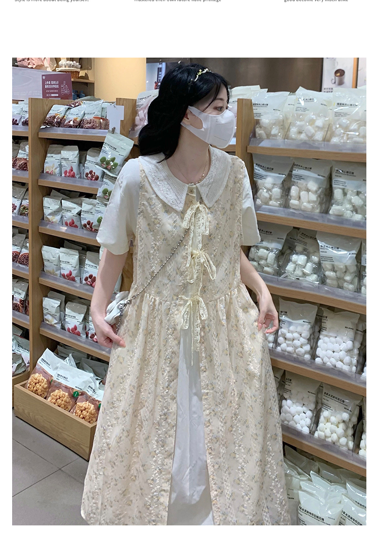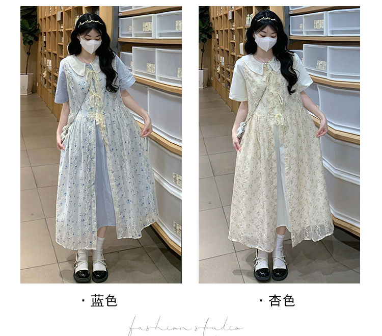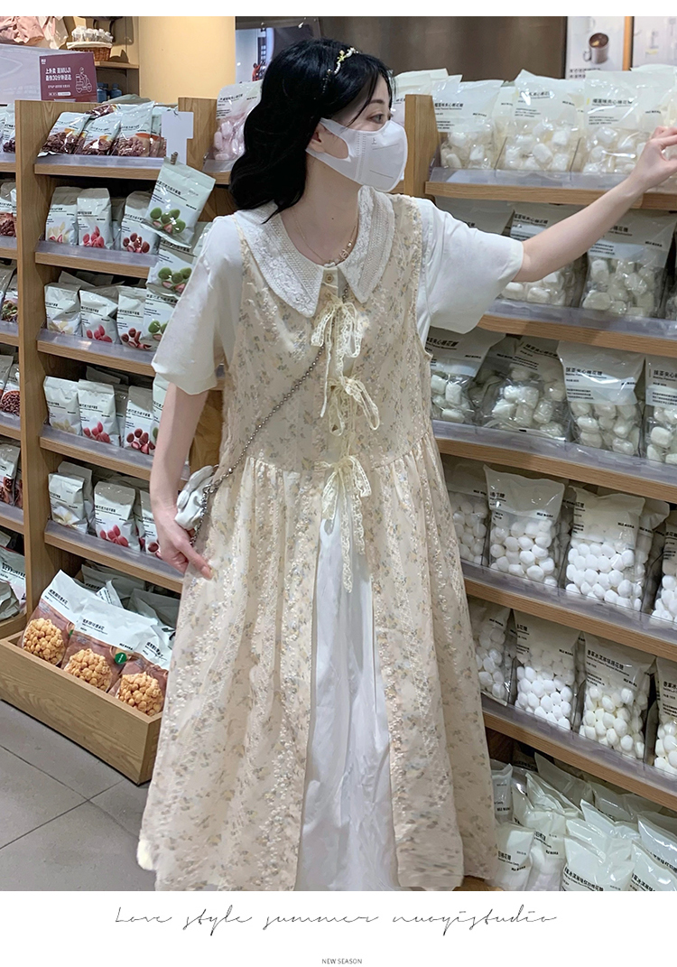 森女甜美部落2025夏季小清新套裝裙小衆短袖連衣裙罩衫曡穿兩件套