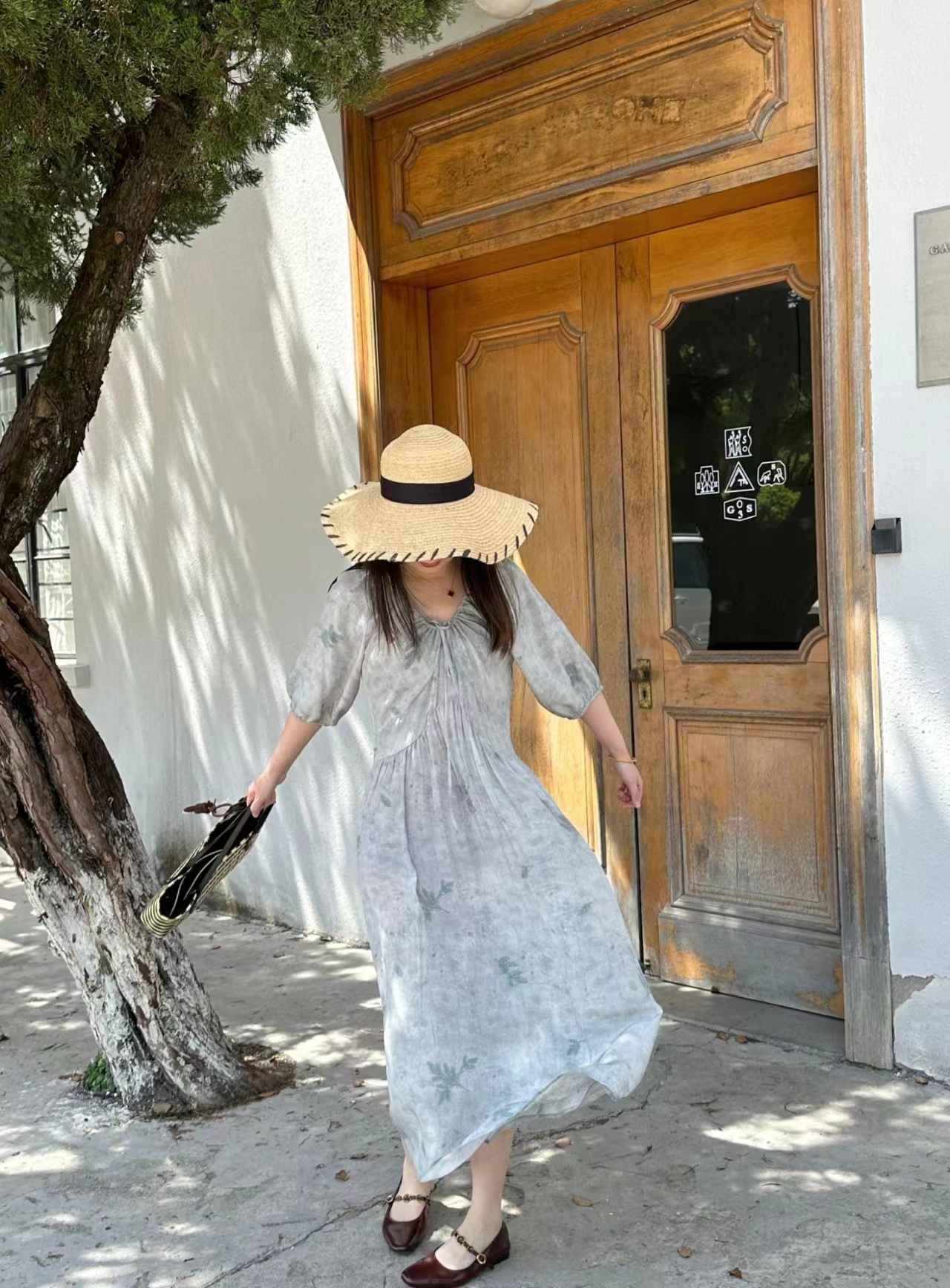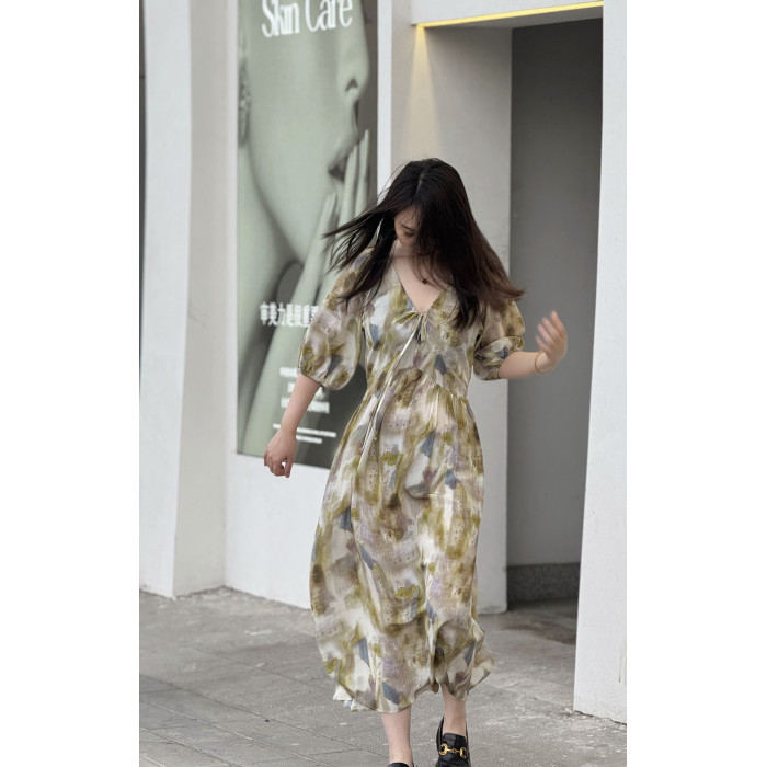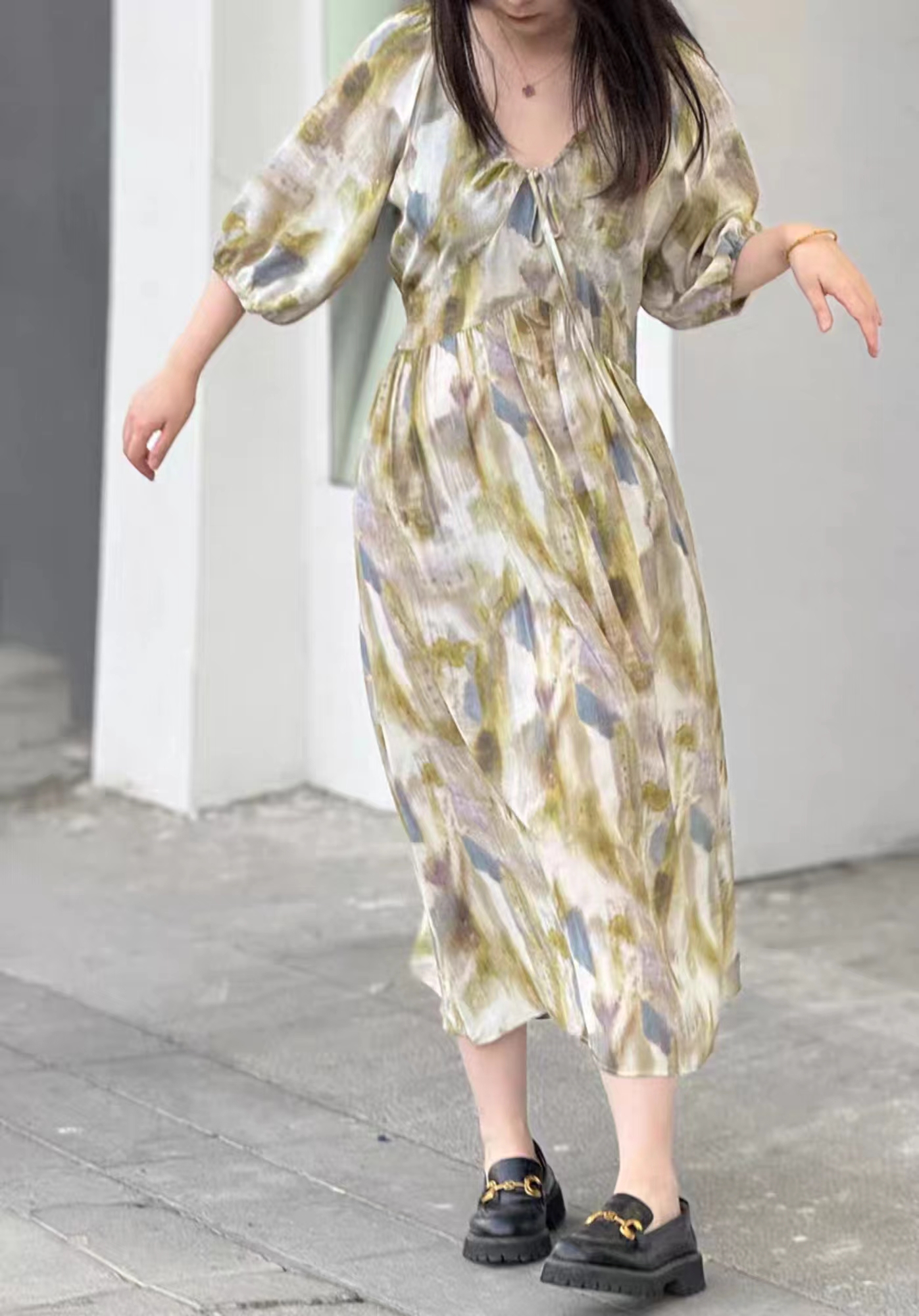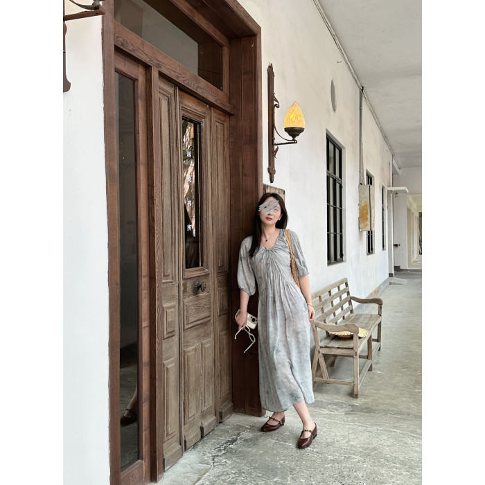 夢絲源2025夏新100%桑蠶絲真絲寬松顯瘦連衣裙女長款V領雙縐裙