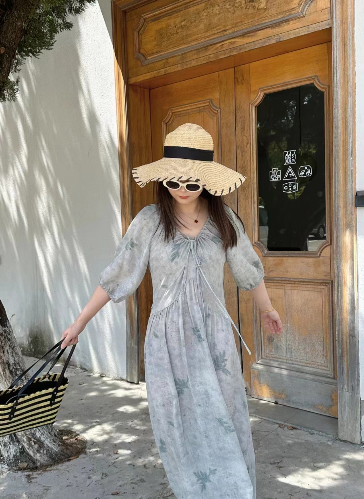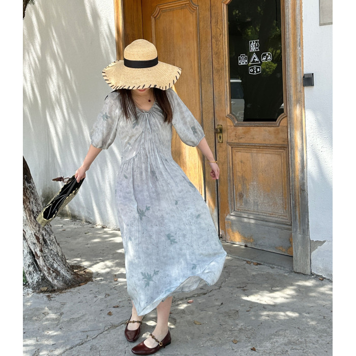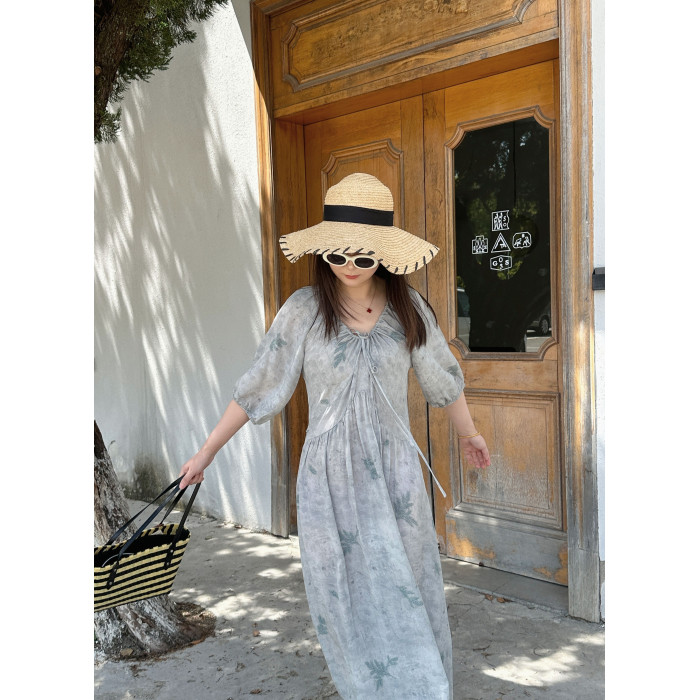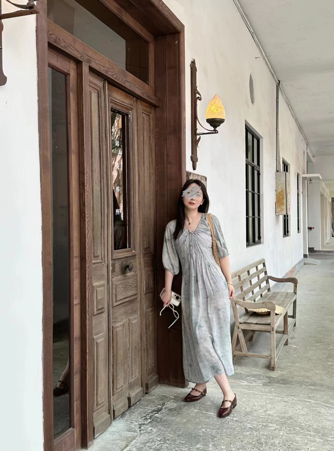 夢絲源2025夏新100%桑蠶絲真絲寬松顯瘦連衣裙女長款V領雙縐裙