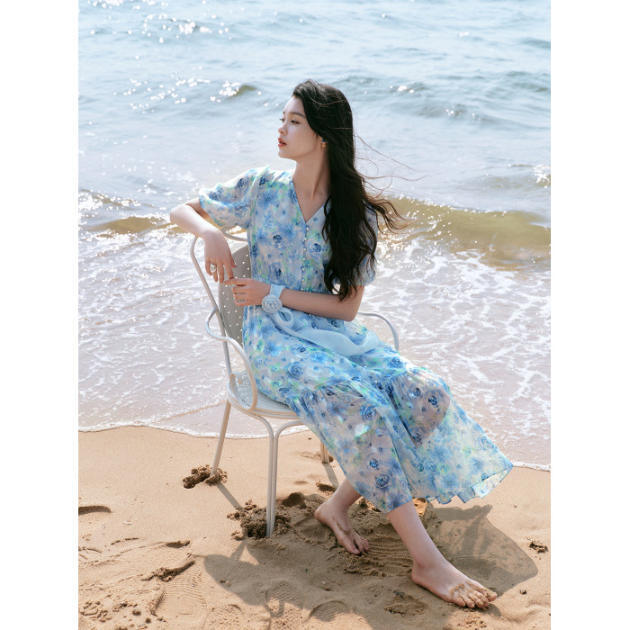 【喬訢同款】珂萊蒂爾2025夏新款茶歇印花V領連衣裙女長款飄逸裙