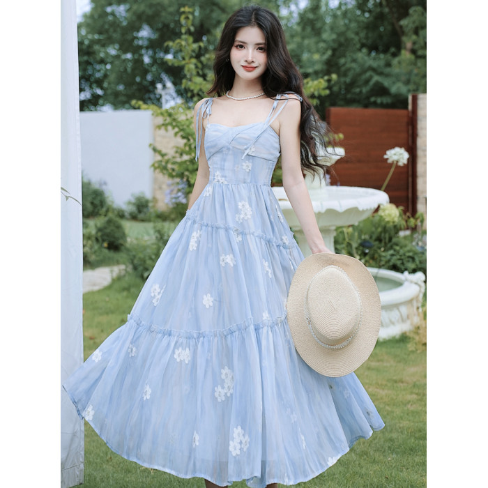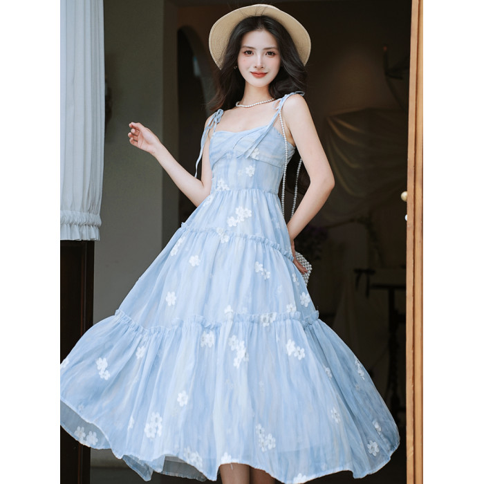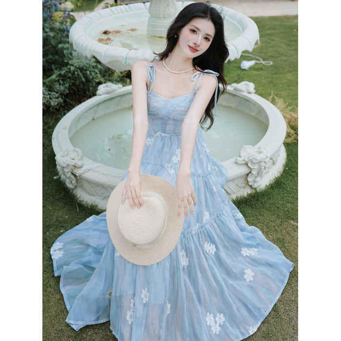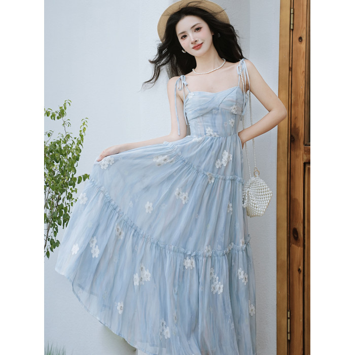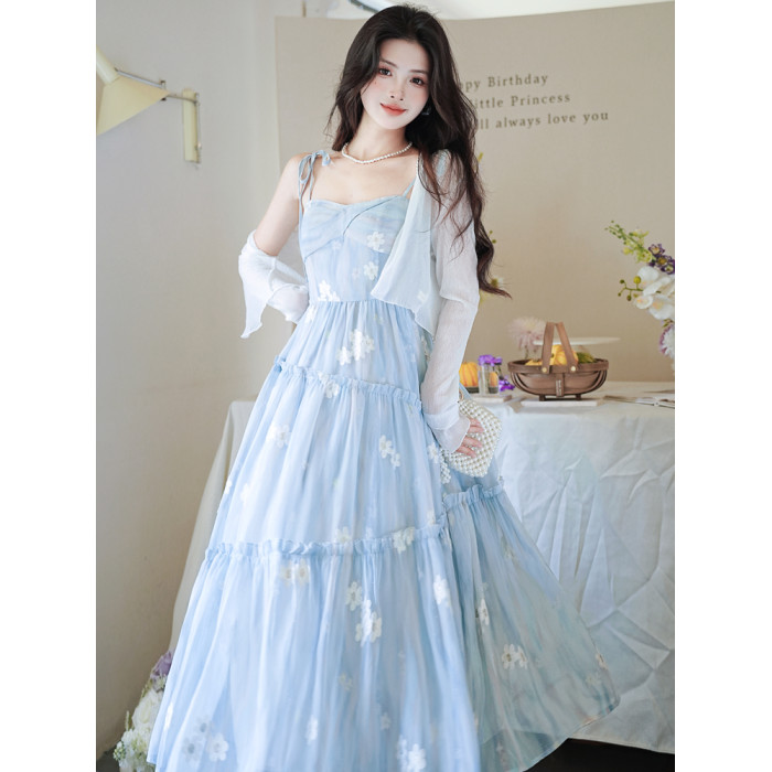 夏日絕美仙女裙子氣質超仙藍色碎花吊帶連衣裙加開衫兩件套裝穿搭
