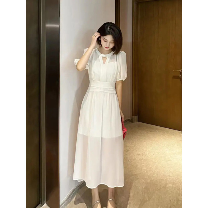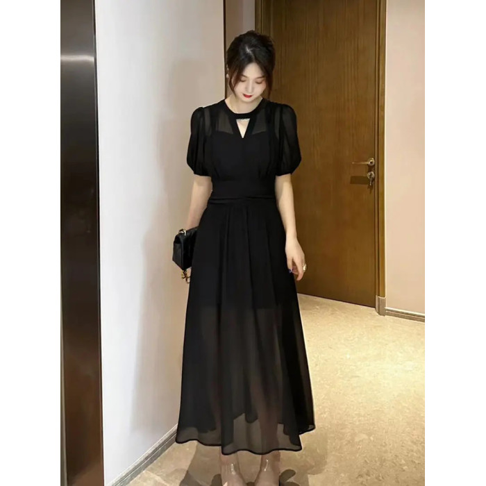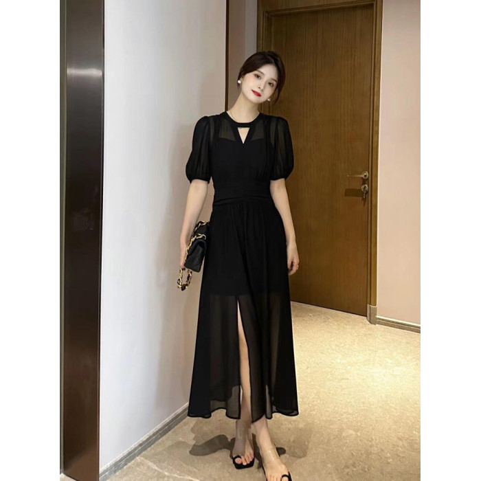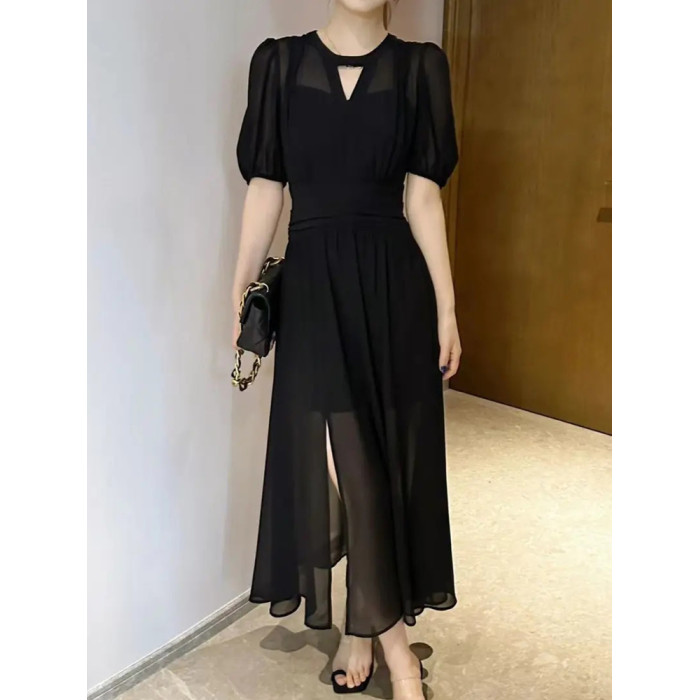 2025夏季新款法式赫本風小黑裙收腰顯瘦開叉長裙黑色雪紡連衣裙女