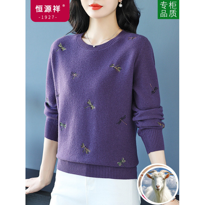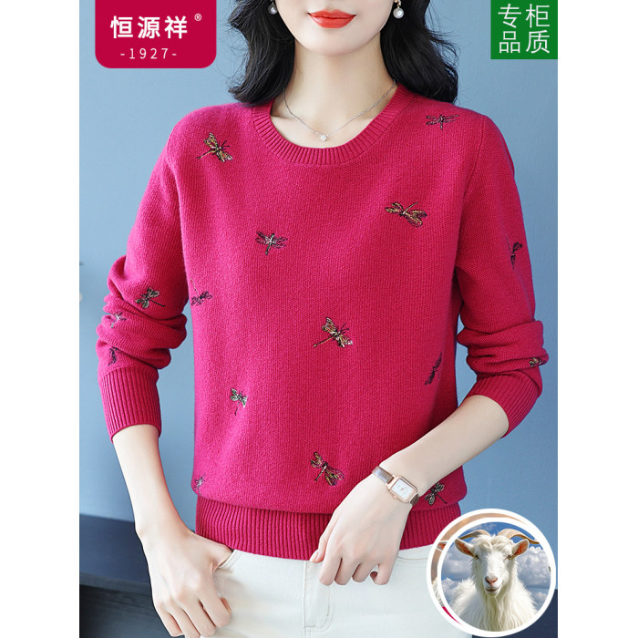 恒源祥100純羊毛衫女秋冬新款圓領毛衣寬松針織媽媽裝內搭打底衫
