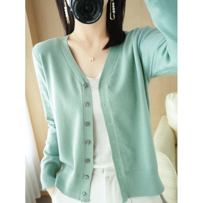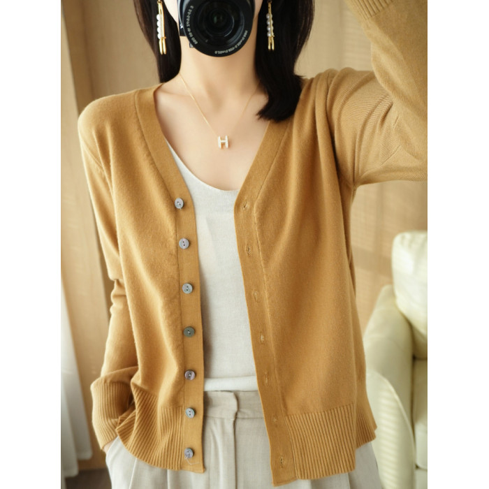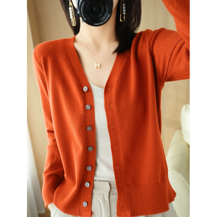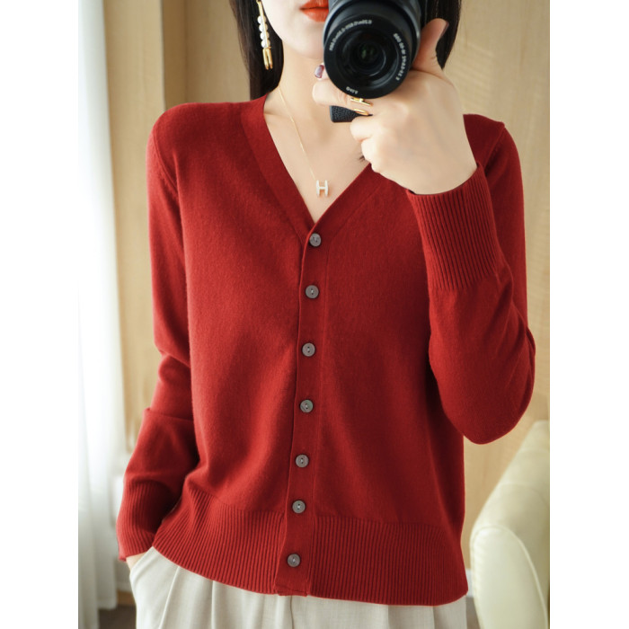 秋冬棗紅針織開衫毛衣女外套寬松韓版V圓領短款打底衫長袖小上衣