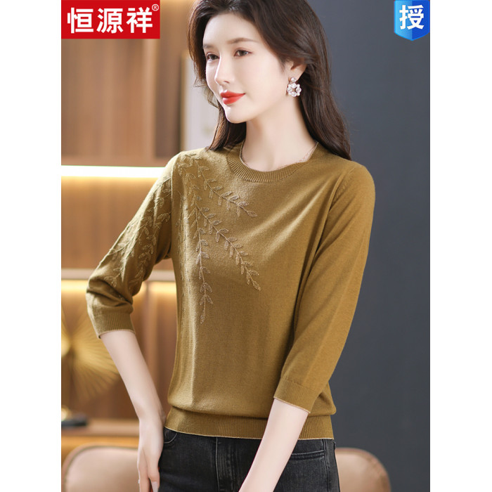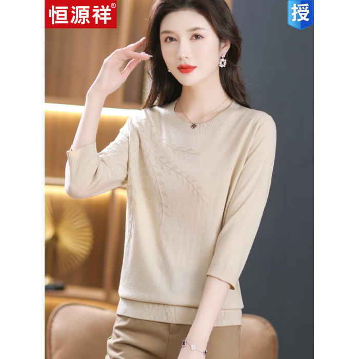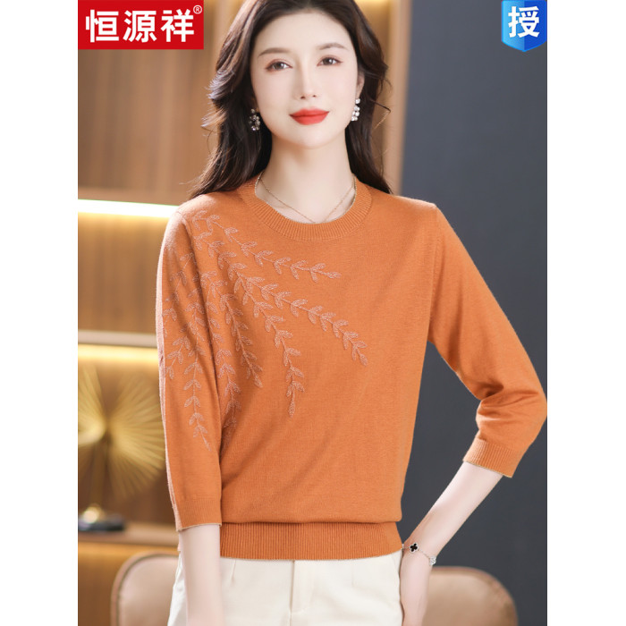 恒源祥春夏七分袖針織衫女洋氣綉花中袖羊毛衫寬松大碼半袖打底衫