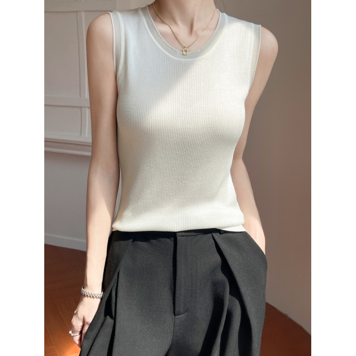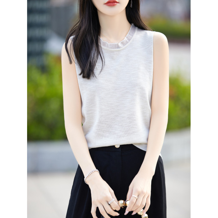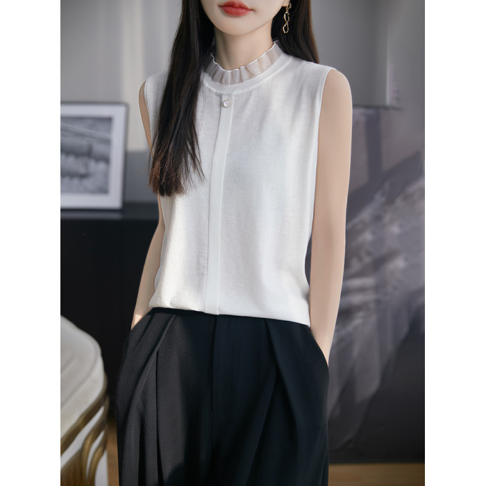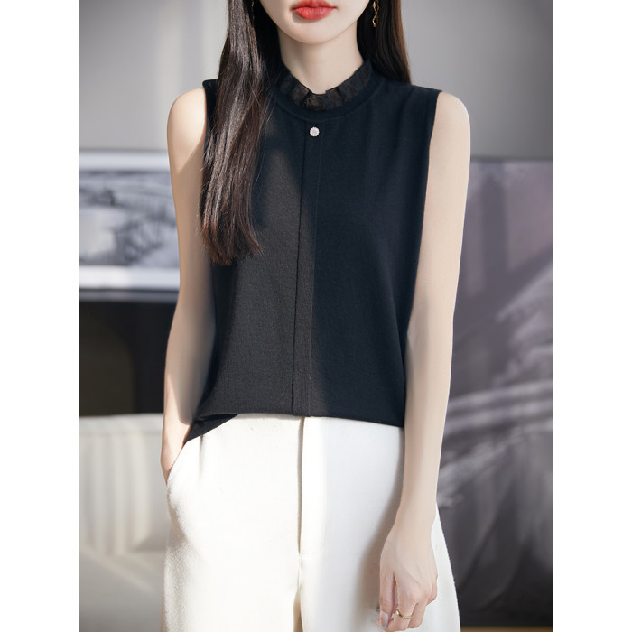 春新款花邊半高領精紡羊毛背心無袖歐根紗拼接吊帶優雅針織打底衫
