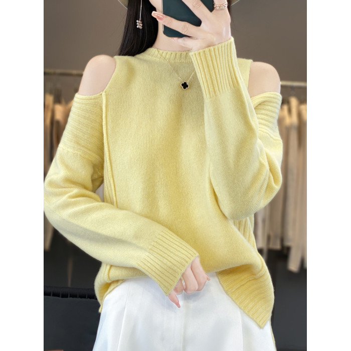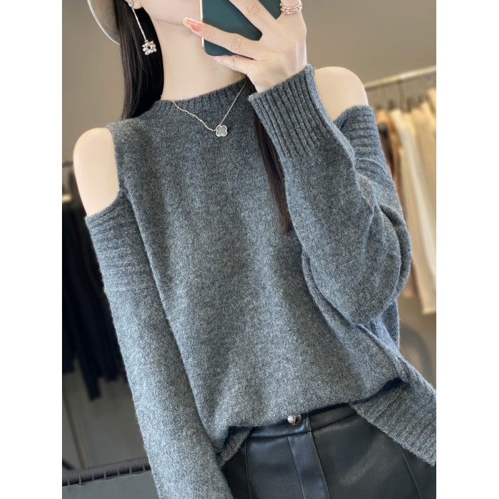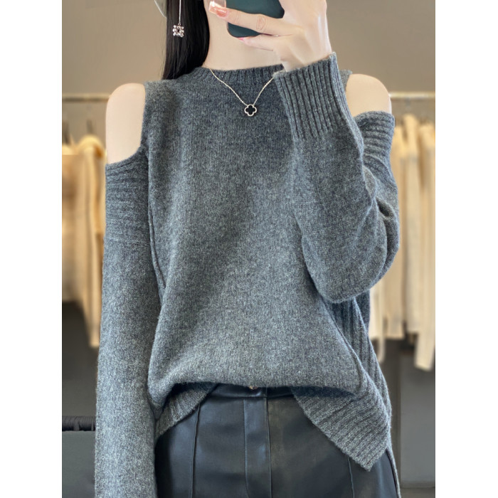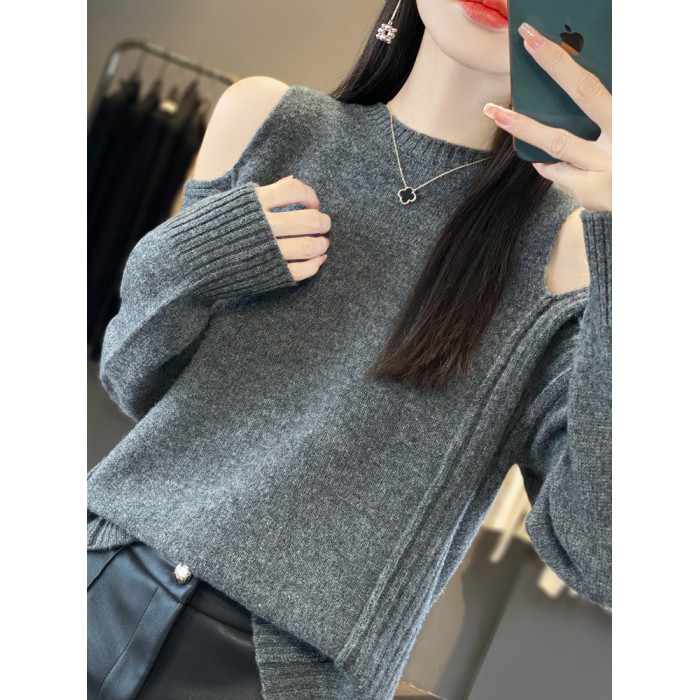 慵懶寬松漏肩羊絨毛衣秋冬新款圓領純色性感上衣羊毛針織打底衫女