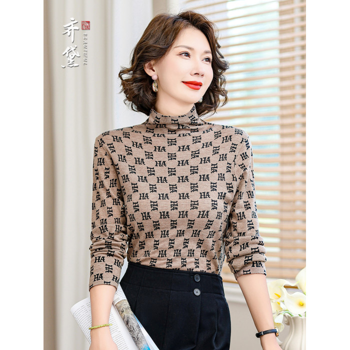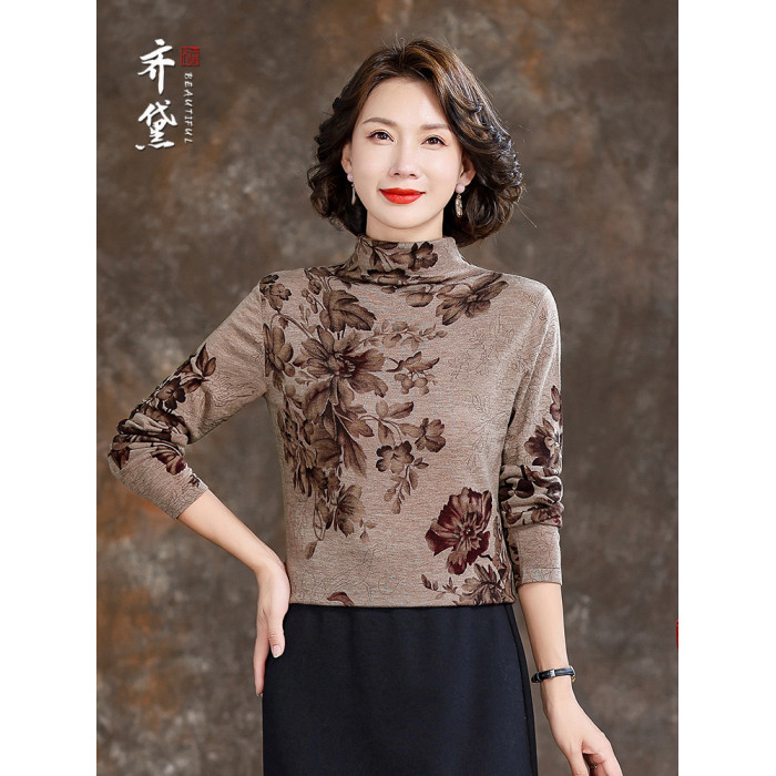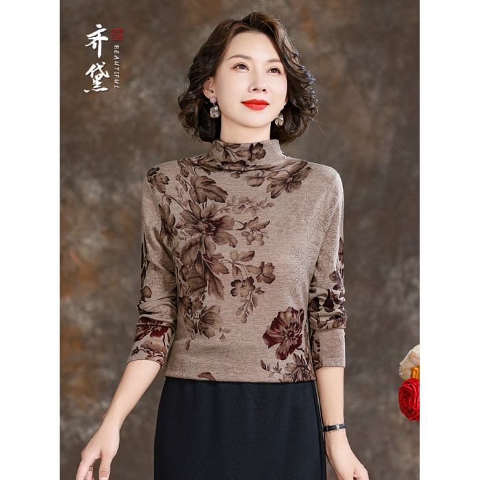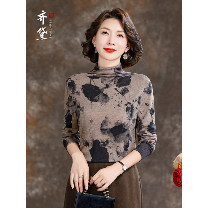 齊黛品牌媽媽水溶羊毛打底衫半高領長袖印花保暖套頭百搭針織衫